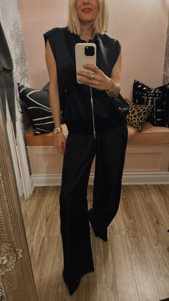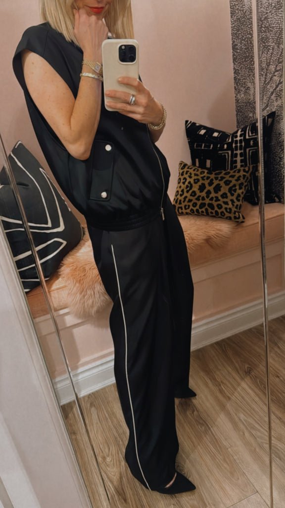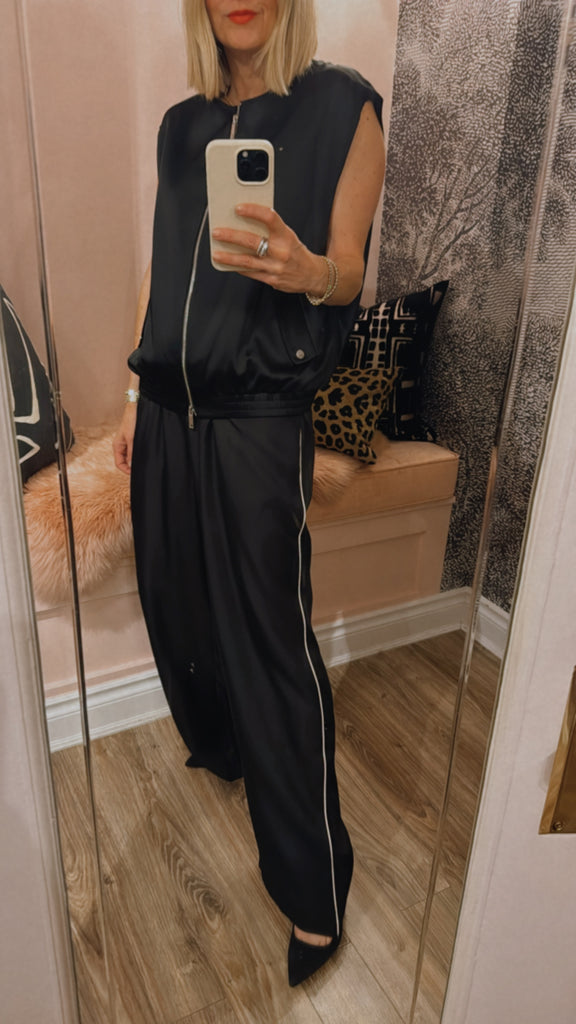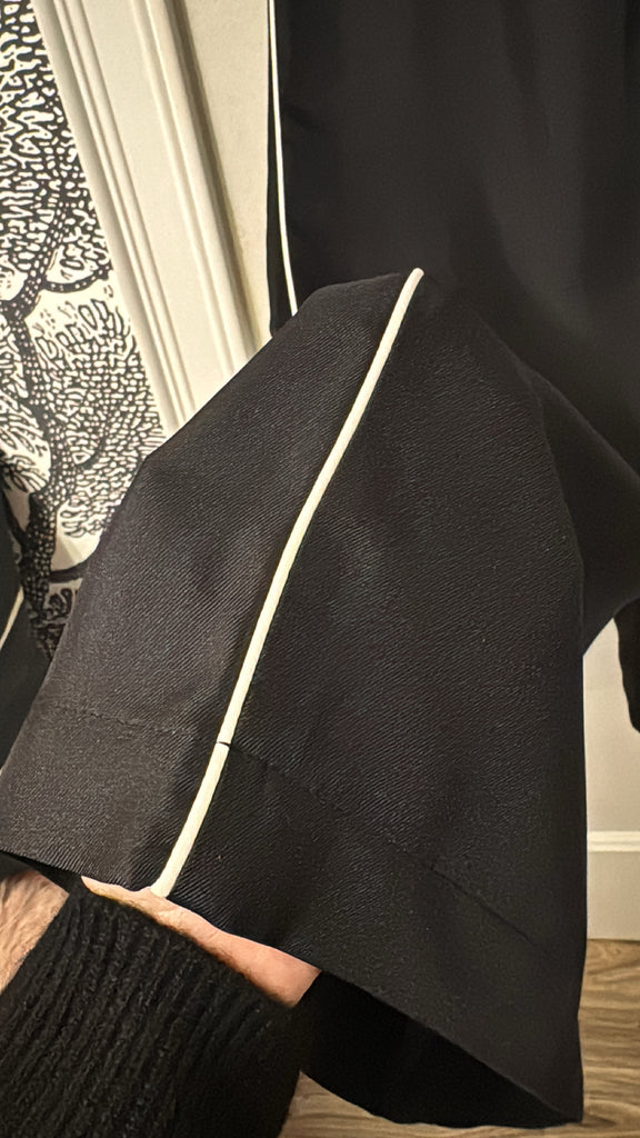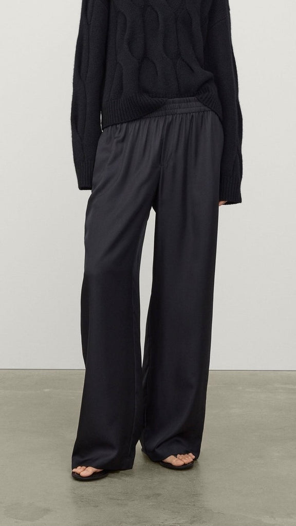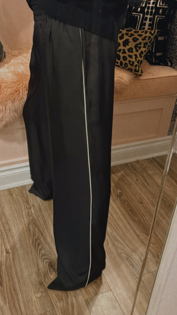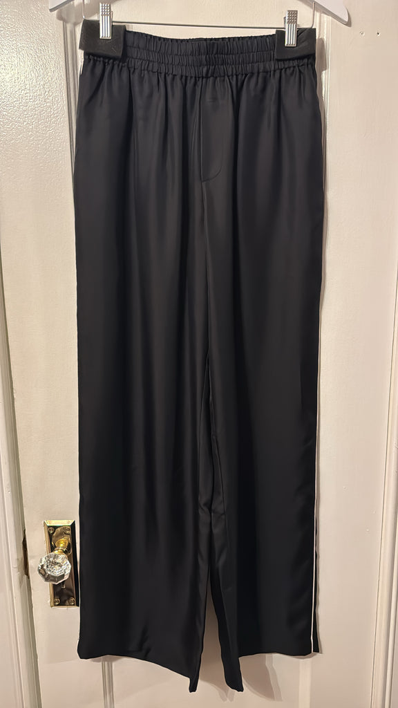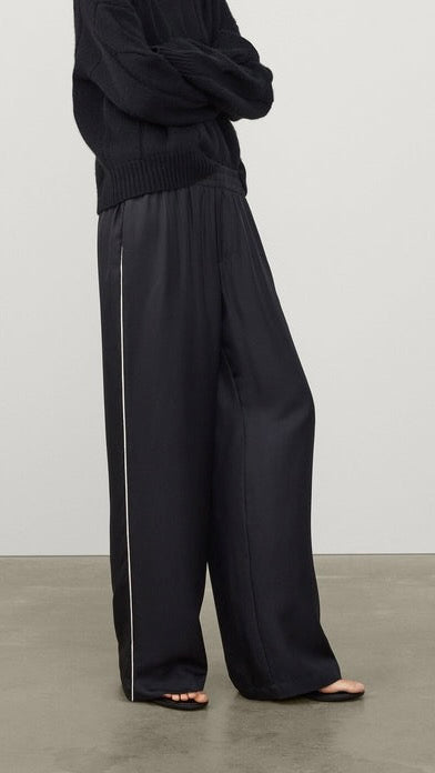 A sporty articulation of silk, the wide leg trousers are crafted in woven silk twill with a subtle shine. The relaxed fit, wide silhouette falls from an elasticated high waist into full-length legs and is finished with a contrast piping along the sides.