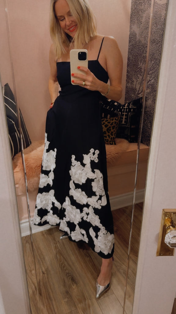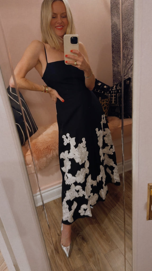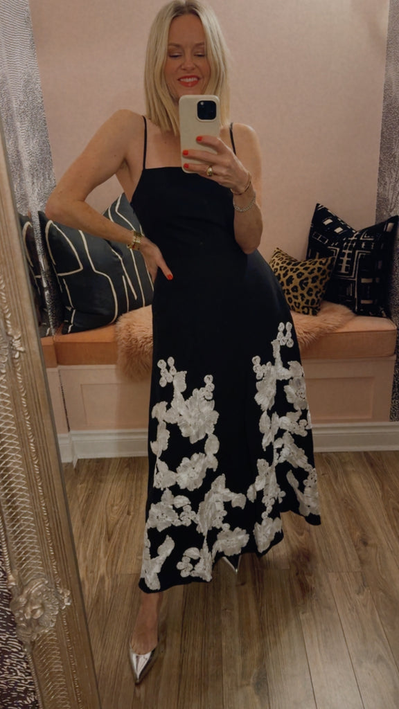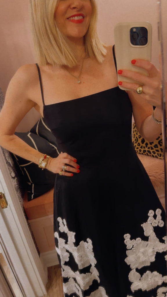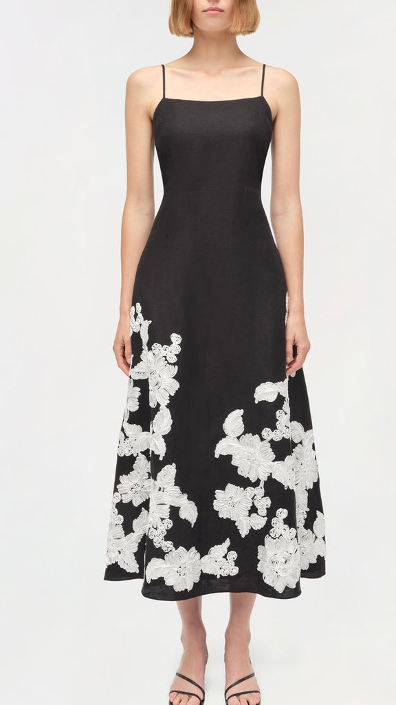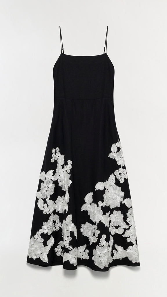 Crafted from a structured yet breathable linen blend, this dress is traced with delicate soutache embroidery that contrasts its clean lines. Cut to a flattering midi length, the silhouette is finished with a delicate cami neckline for an effortless, refined mood.