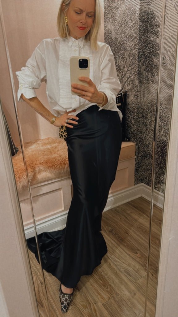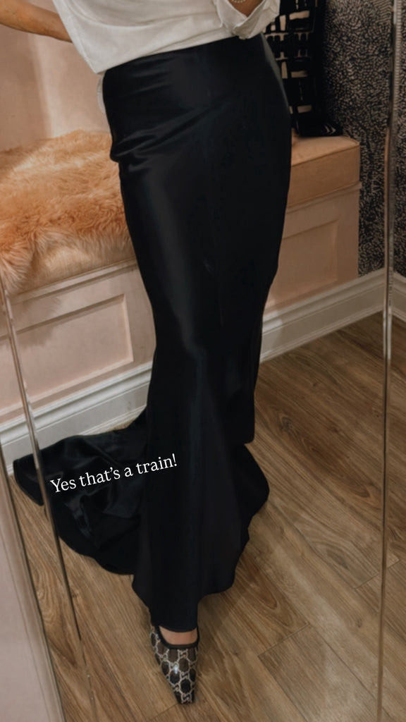Designed for timeless elegance, the Hourston Maxi Skirt in Black offers sophistication with its fluid silhouette. Cut on the bias from lustrous satin, this high-waisted design skims the body, falling into a graceful back train. Fully lined for a smooth fit, the skirt is secured with an invisible centre-back zipper, making it perfect for elevated styling.
