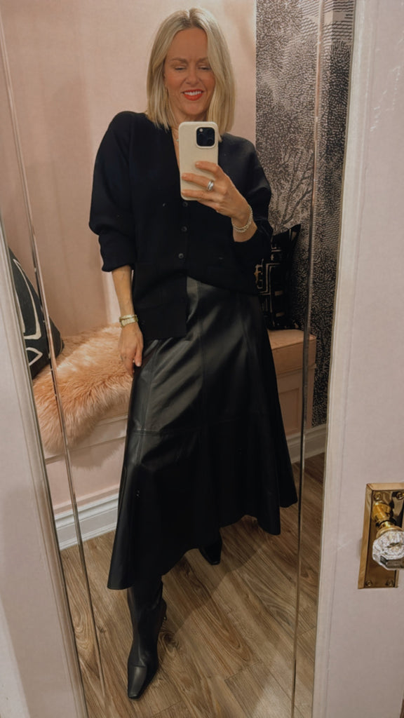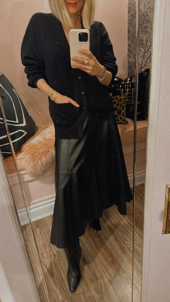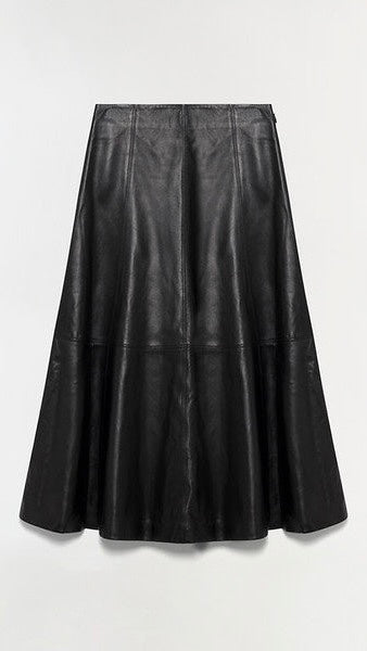 Crafted in smooth leather, this midi skirt showcases a sleek silhouette. The subtle flaring of the hem lends dimension to the polished surface, while precise paneling enhances the sculptural form. Both directional and versatile, it serves as a foundation for elevated dressing.