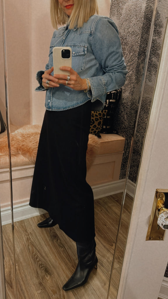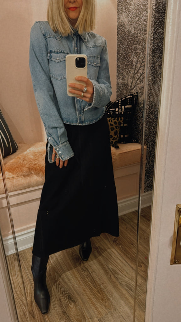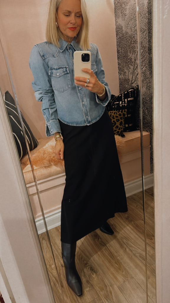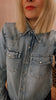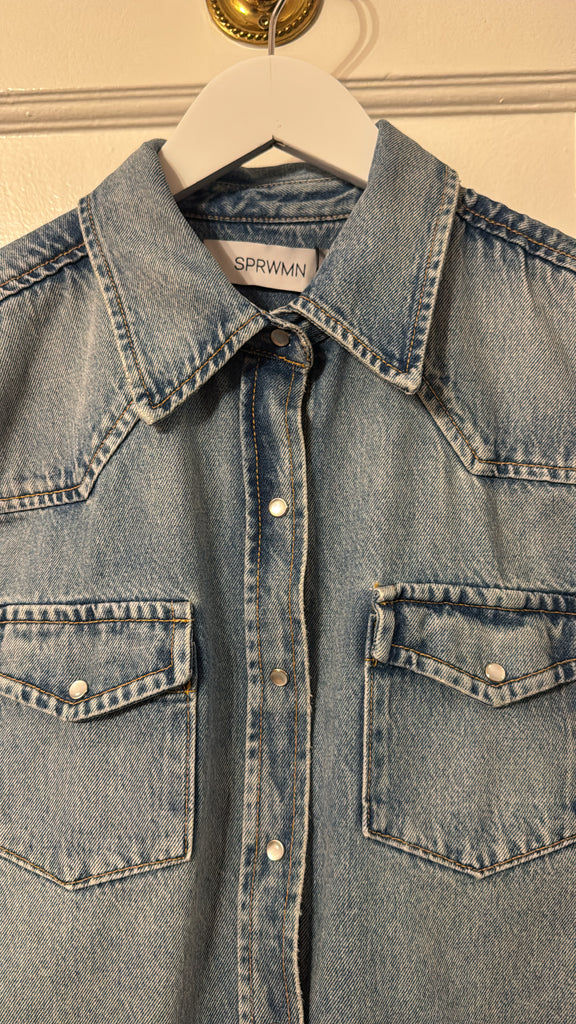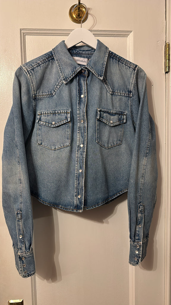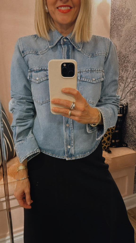 A luxe, cropped take on a classic utilitarian style button down; this western collared button down is made from 100% cotton for a classic denim look and feel. Finished with pearlescent buttons and western-style front chest pockets.