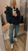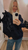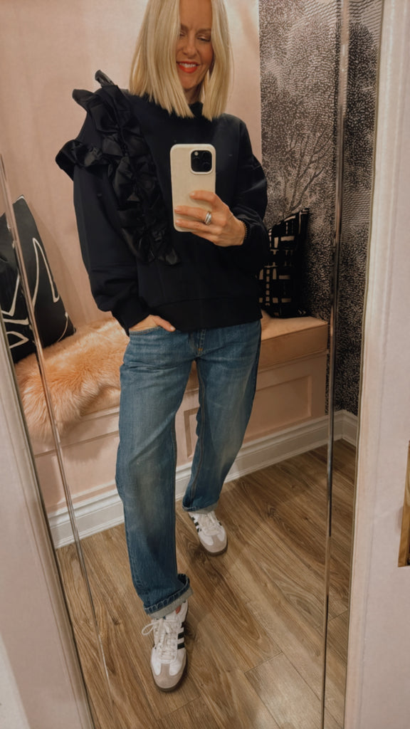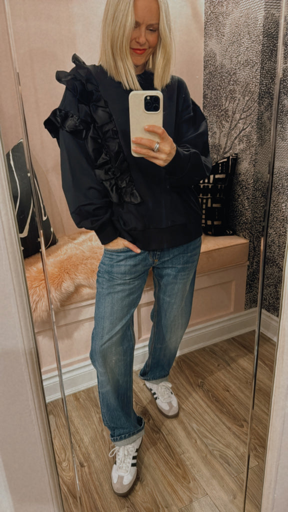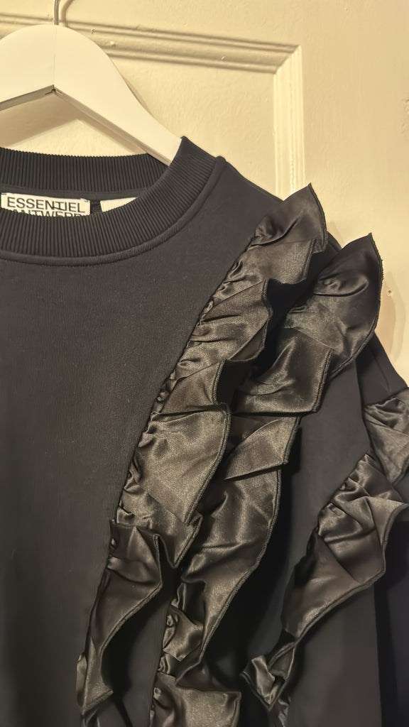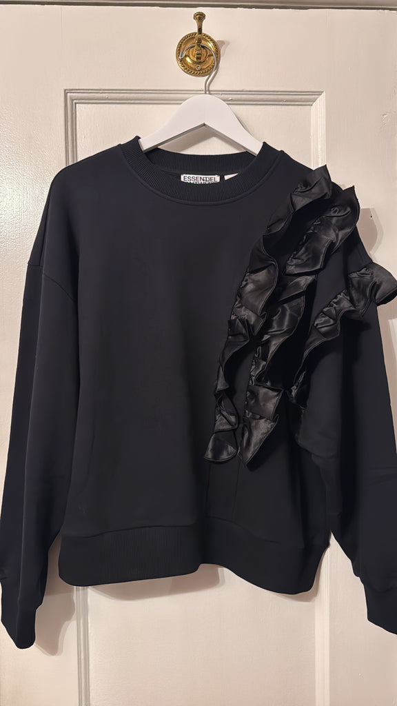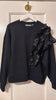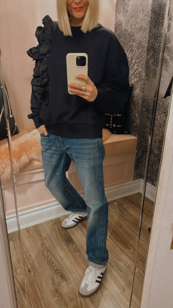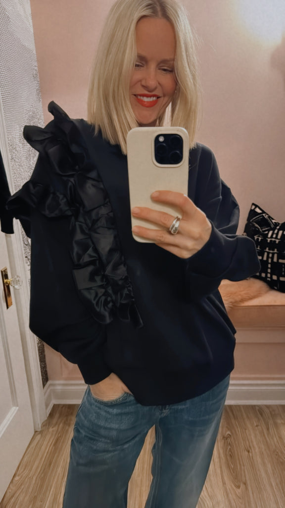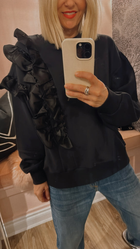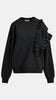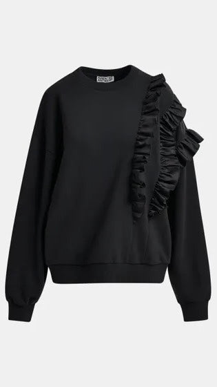 Sweatshirt offers an elevated twist on a casual staple. Constructed from a cotton-blend fabric, it’s designed for a relaxed fit with dropped shoulders for a laid-back silhouette. The standout feature is the asymmetric ruffle detailing across the front and shoulder, adding textural contrast and a feminine edge to the otherwise minimal design. Ribbed cuffs, hem, and neckline ensure structure and durability, making this a stylish yet practical layering piece for cooler days.