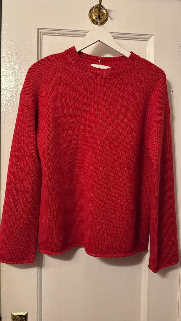 A crewneck with modern character, the Kristy sweater is crafted in Lisa's heavy knit cashmere with a textured hand feel. The relaxed fit, longline silhouette is accented by a wide crew neck, drop shoulders, wide full-length sleeves and ribbed trims, with a rolled hem for a touch of tactility.