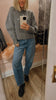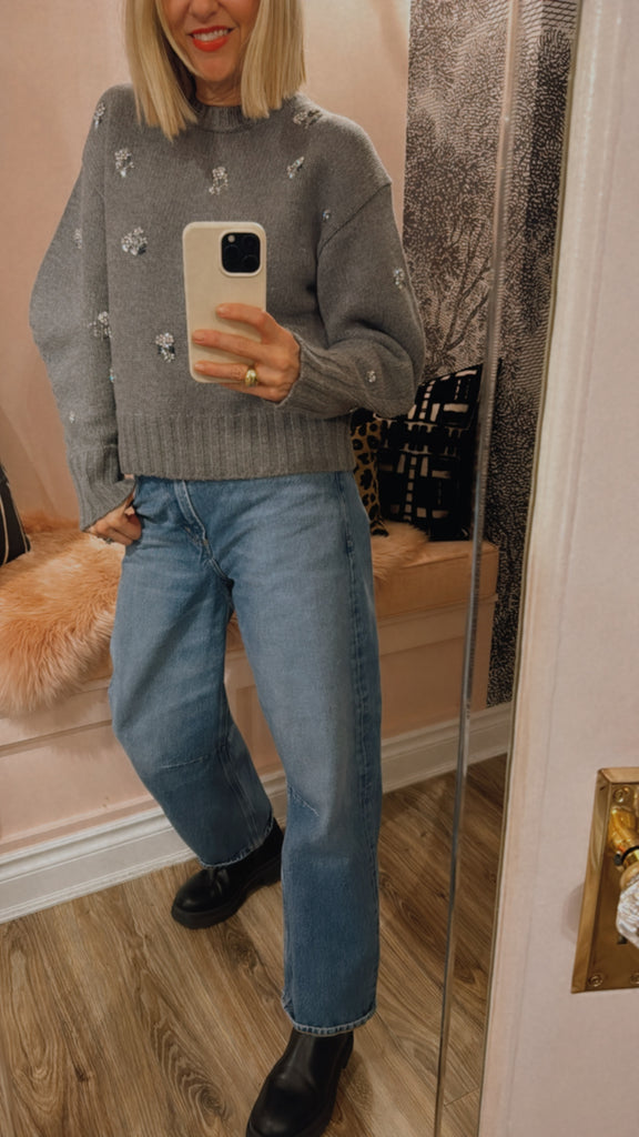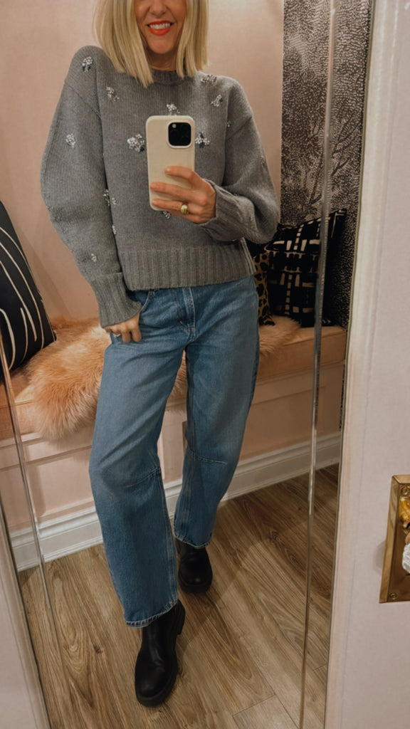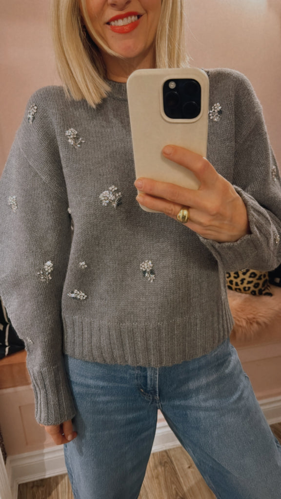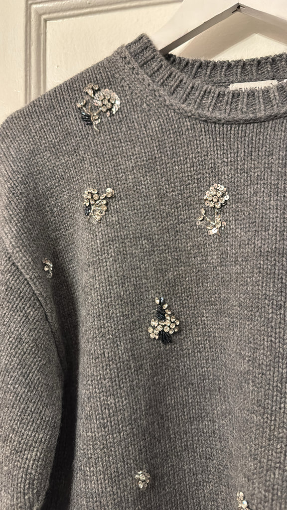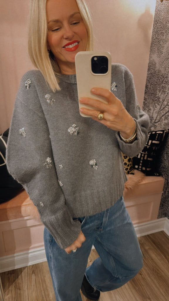 A classic crew neckline knit sweater updated with voluminous sleeves and allover crystal embellishments.