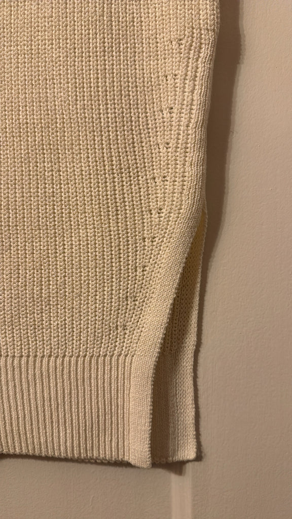 The Memphis Knit Top is crafted from a cotton-linen blend in classic ivory, inspired by coastal calm. Featuring a dimensional rib stitch, extended shoulders, and an asymmetric split that wraps around the front, it offers a simple yet refined aesthetic.