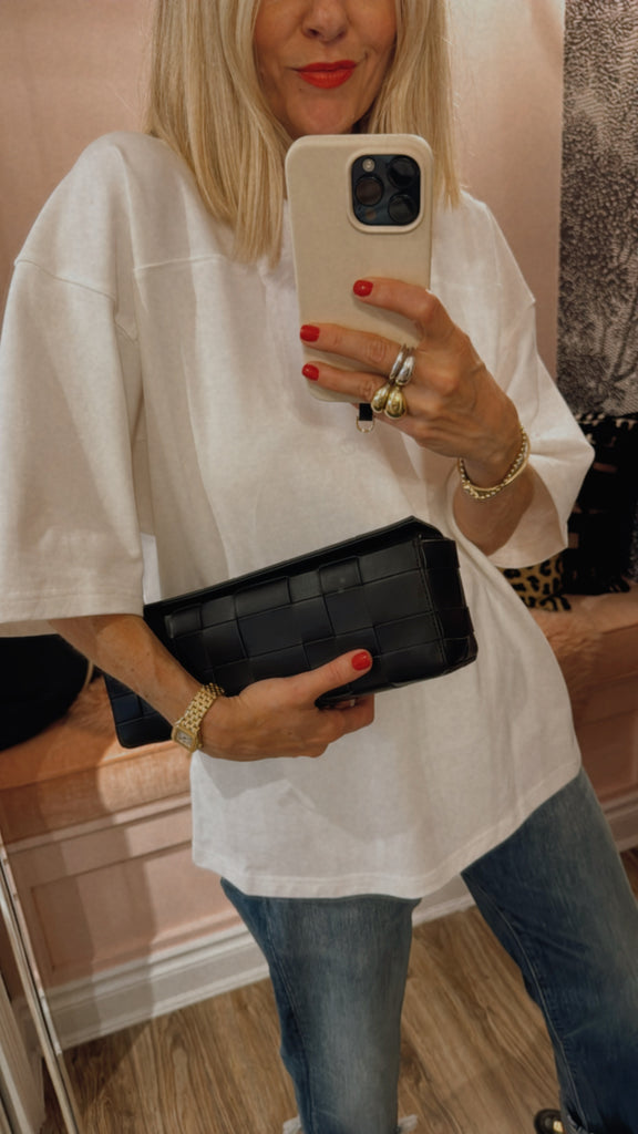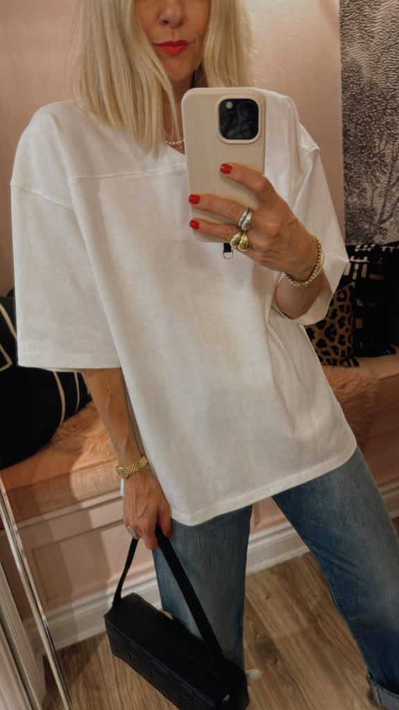 Rebecca is 5’5, and typically a size 4. She is wearing size Medium/Large for a slouchier fit.