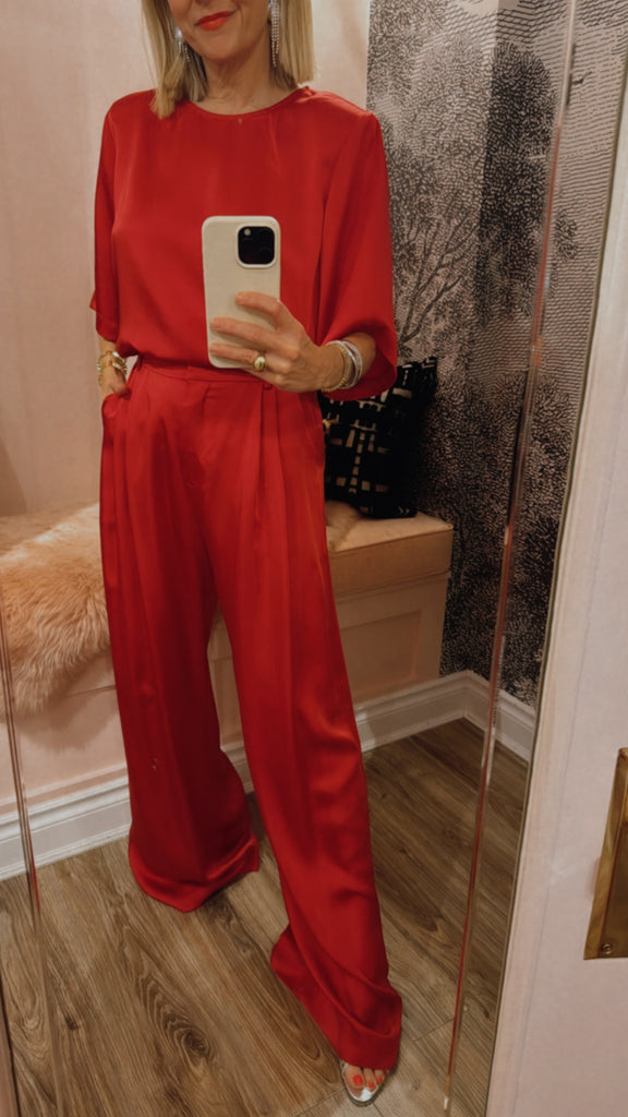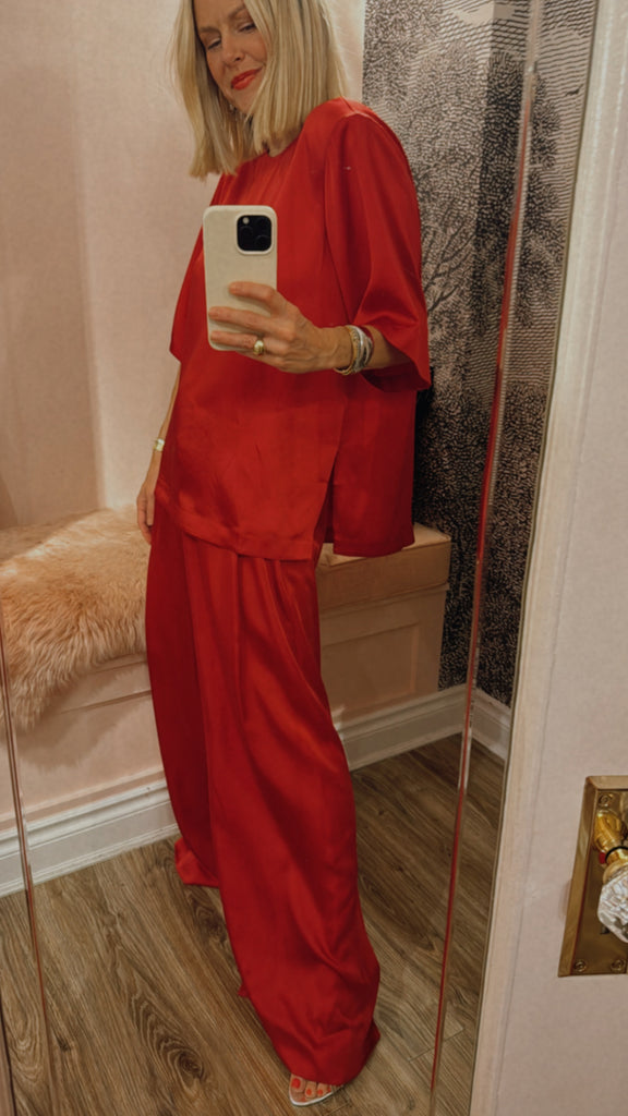 The Elysian Tee, an elevated relaxed silhouette, crafted in our signature cupro blend in a fiery sunset red. Featuring a dropped shoulder, wide sleeve, and hi-low hem with a soft curve and side splits, it offers subtle structure with removable shoulder pads. Pair with the Whirlwind Pant for a coordinated set that exudes modern simplicity.