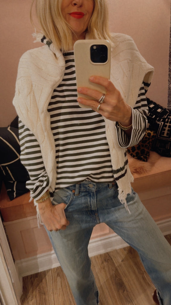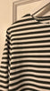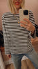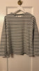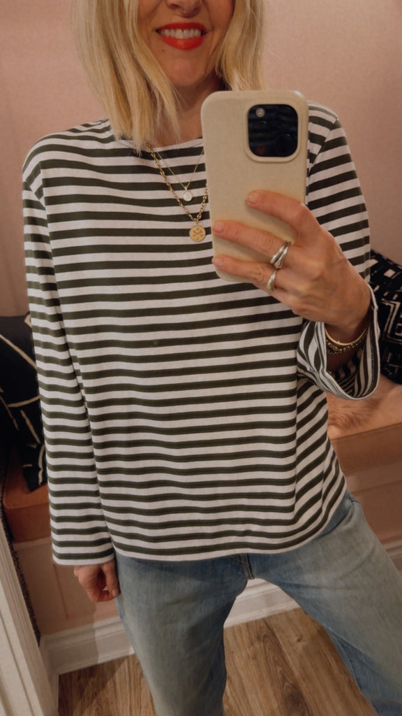 Straight-cut long sleeve tee with a boat neckline. Features horizontal olive and ecru stripes in a clean, minimal silhouette.