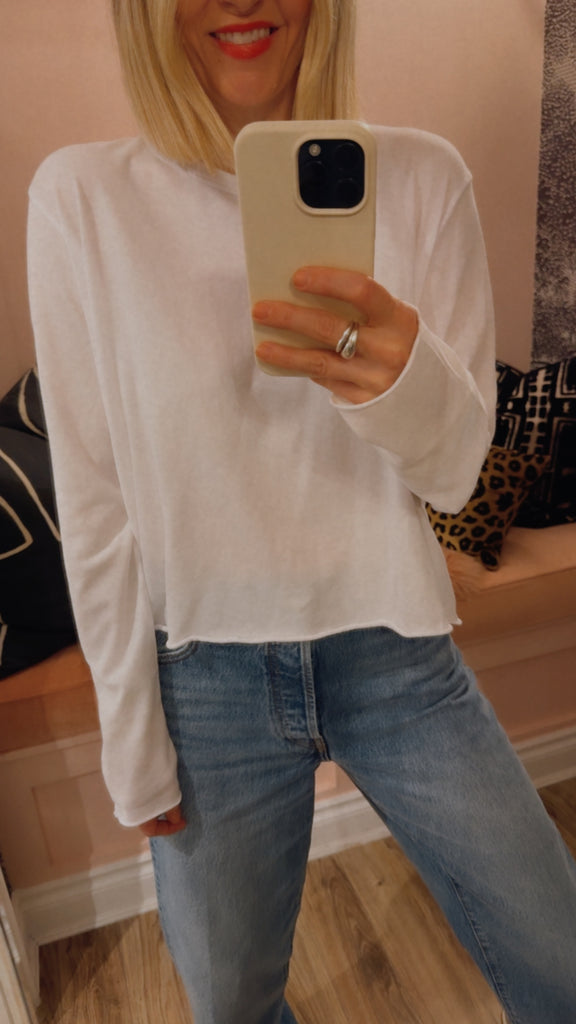 Our cherished square cropped tee updated with longer, slim arms that are perfect for layering under everything. This tee is boxier with shorter proportions and a signature raw hem and cuffs. Handcrafted locally in Los Angeles, our process ensures beauty and uniqueness—no two pieces are alike.