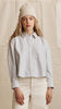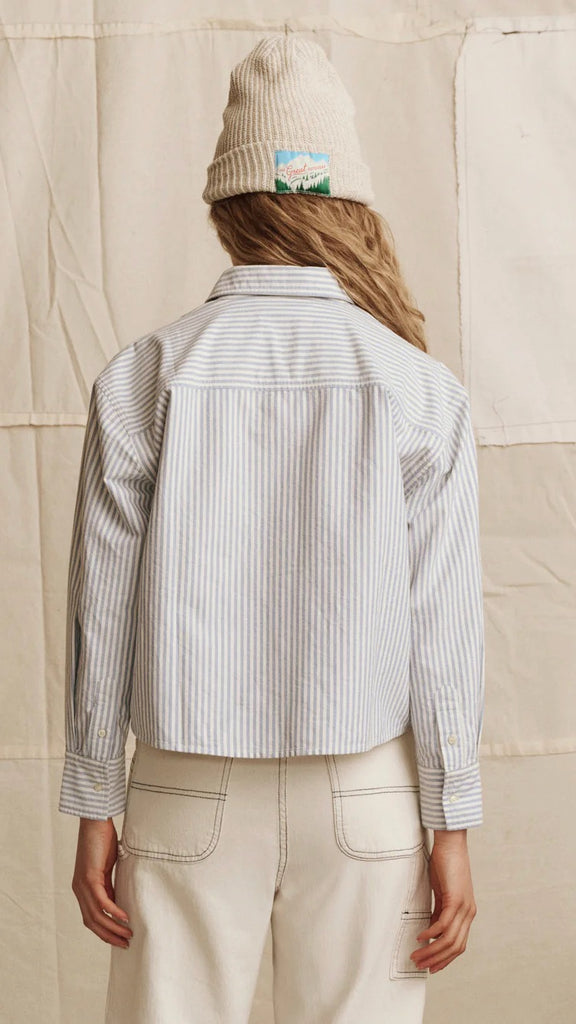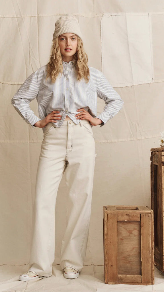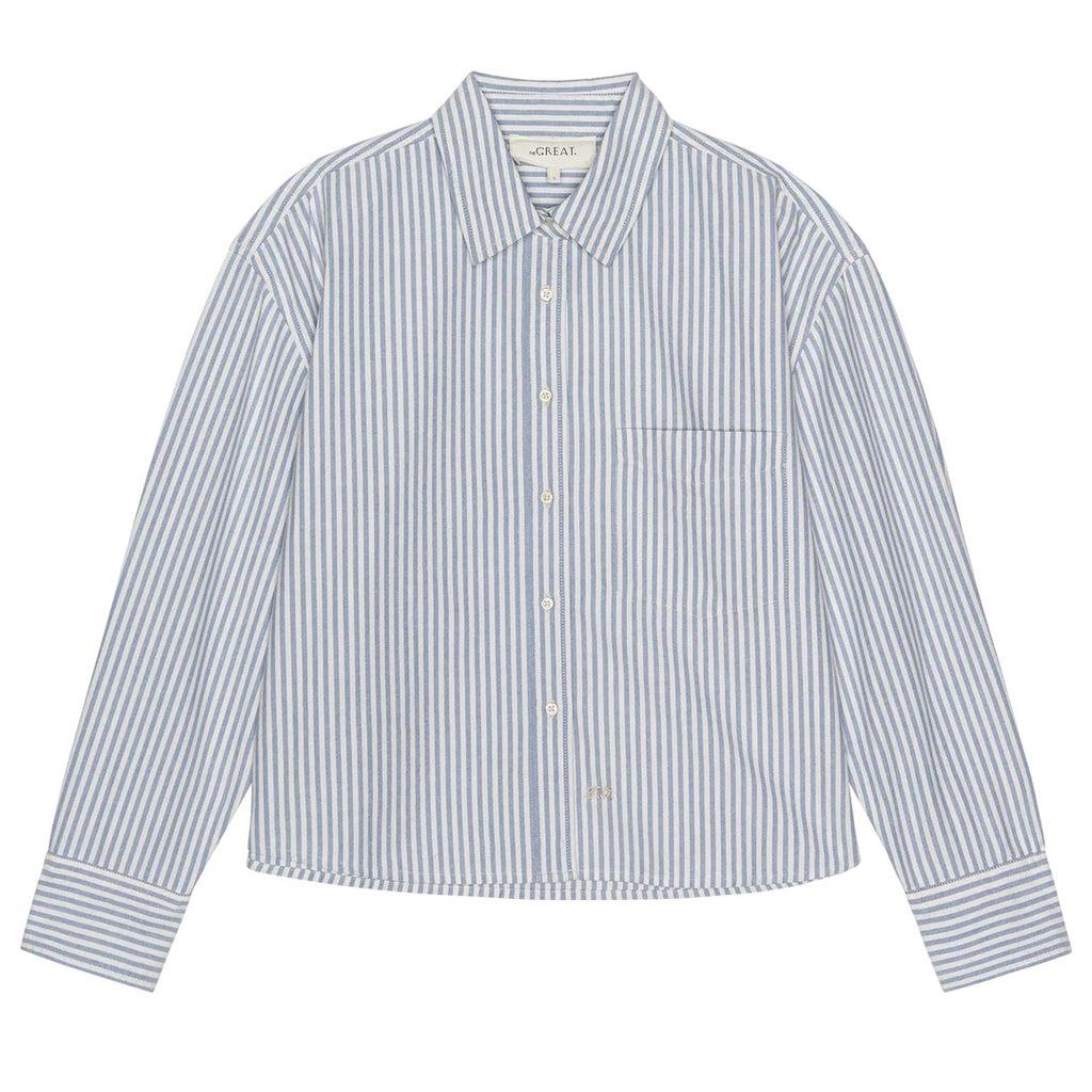 A playful twist on classic shirting. Cut from crisp cotton Oxford, this cropped shirt features a boxy silhouette, traditional tailoring details, and a subtle “TG” monogram embroidered near the hem. It’s the kind of piece that feels both polished and undone—perfect for pairing with denim or satin separates.