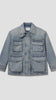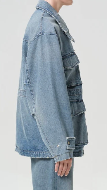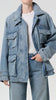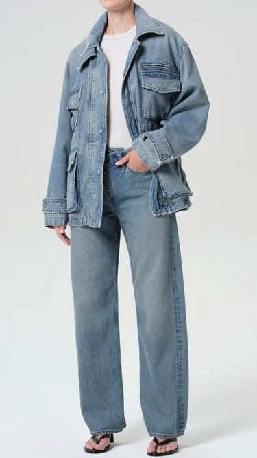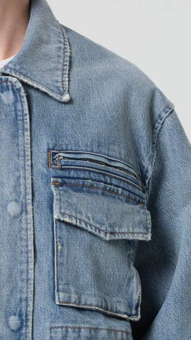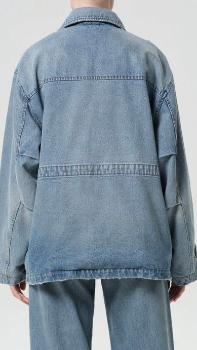 The Aubrey Jacket is a modern utility layer with a vintage sensibility. Designed in a medium tinted indigo wash with subtle fading and marbling, it features oversized front pockets, a drawcord waist, and a structured collar for a refined workwear-inspired look. Crafted from rigid non stretch cotton denim with a soft hand feel, it delivers durability and comfort for effortless all day wearability.