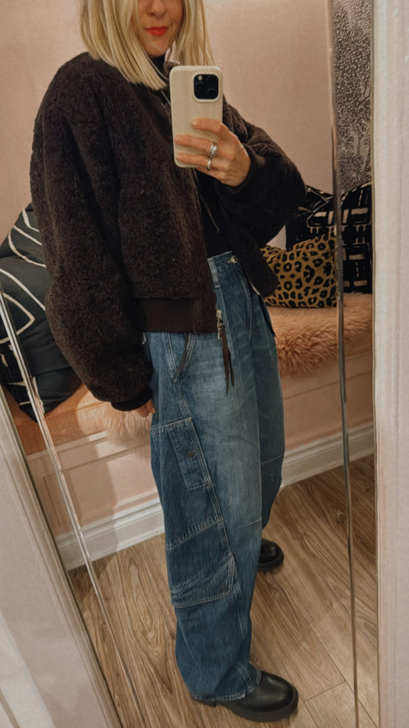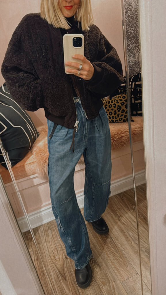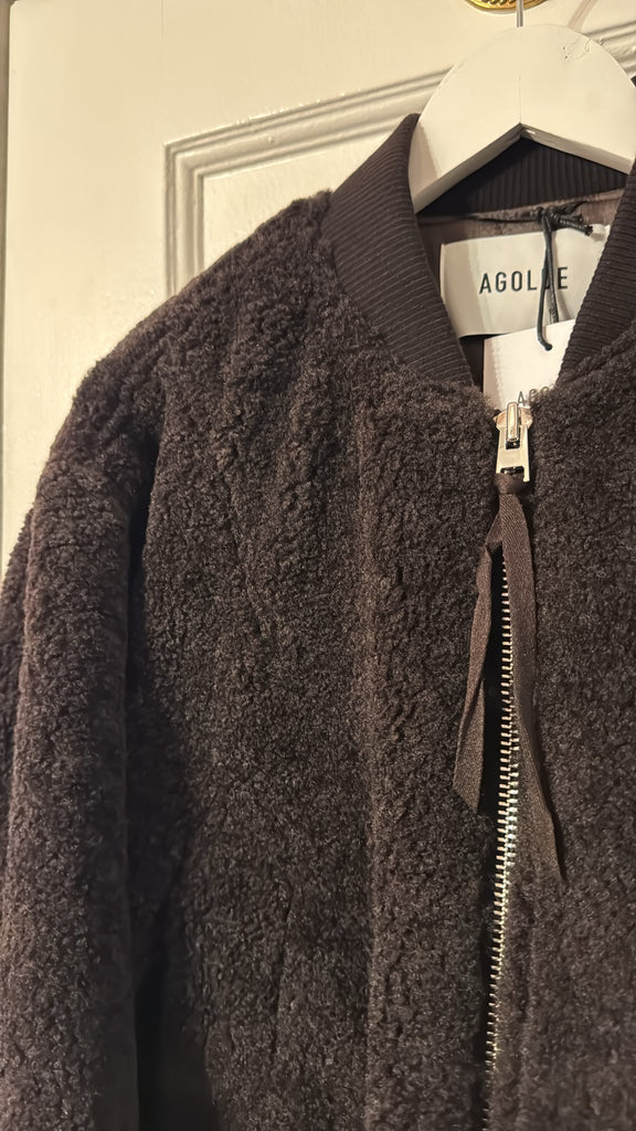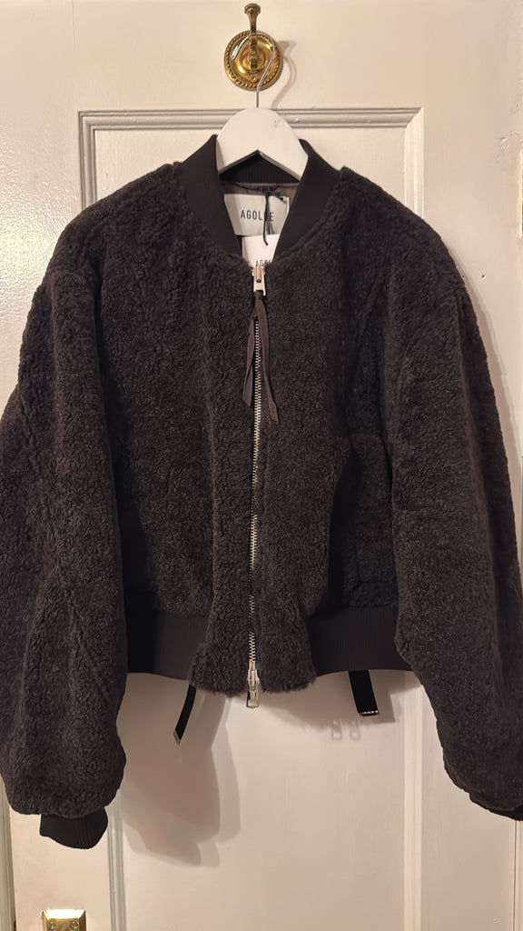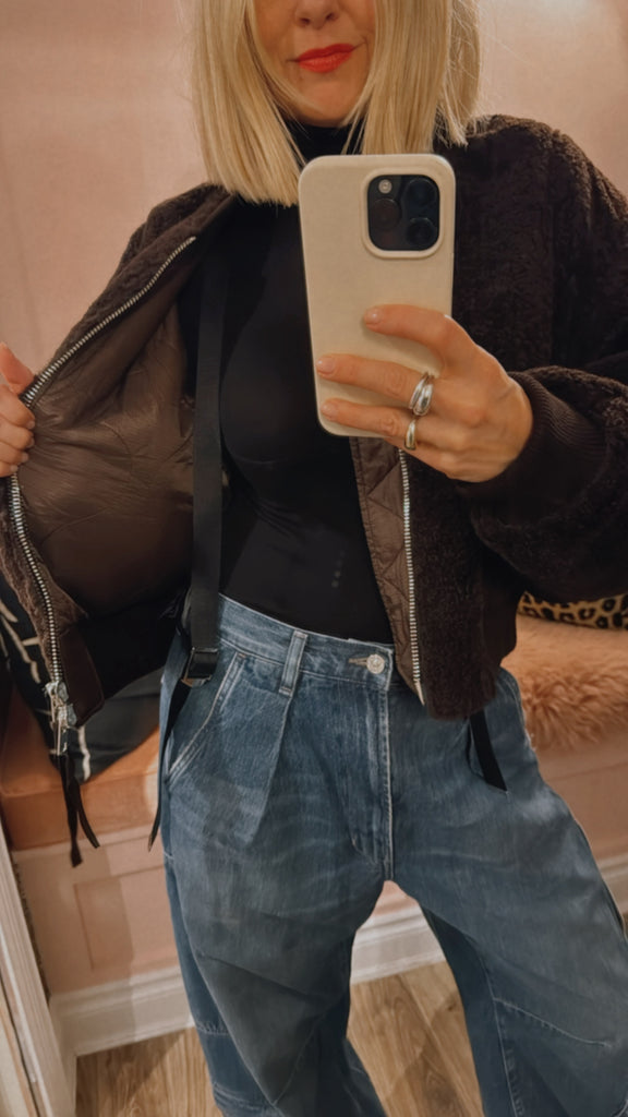 The Iona Skye Jacket is a modern take on the bomber, cut in a cropped silhouette with voluminous sleeves and a zip-front closure. Crafted from ultra-soft sherpa in a rich chocolate brown, it’s equal parts cozy and refined. Layer over denim or tonal separates for a cool, textured finish.