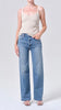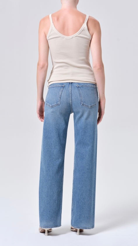A high-rise wide-leg silhouette, the Ren Jean features a flattering high waist, a relaxed fit through the hips, and an easy, elongated leg shape. Rendered in a medium washed-out tinted indigo, it delivers a soft, lived-in look with everyday versatility. Crafted from soft, breathable regenerative cotton denim blended with EcoMade Fiber for light stretch and natural movement, it offers a comfortable worn-in feeling while maintaining a clean, structured finish.