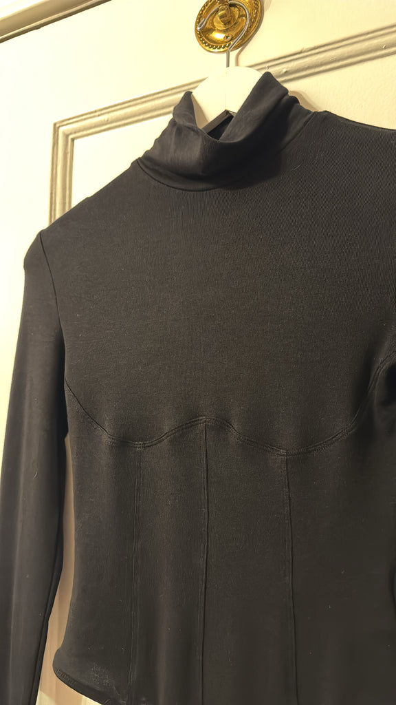 High neck bodysuit with corseted seaming through the waist, and made of a super soft jersey fabric.