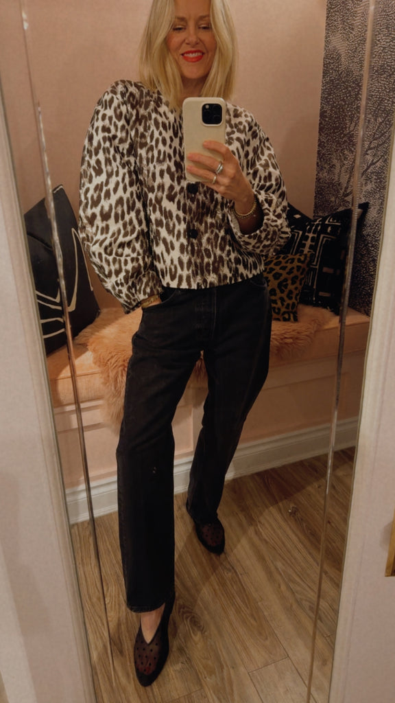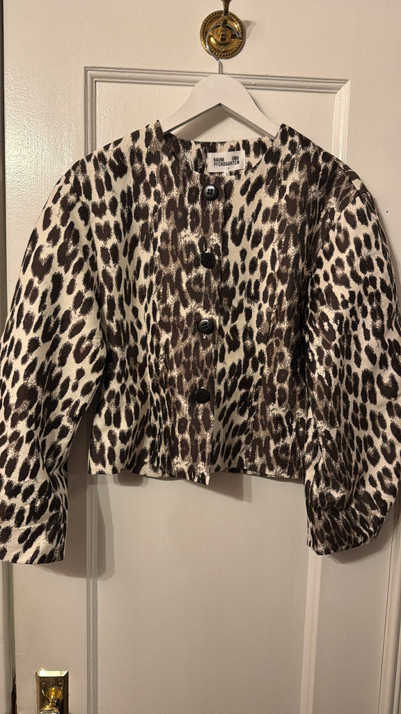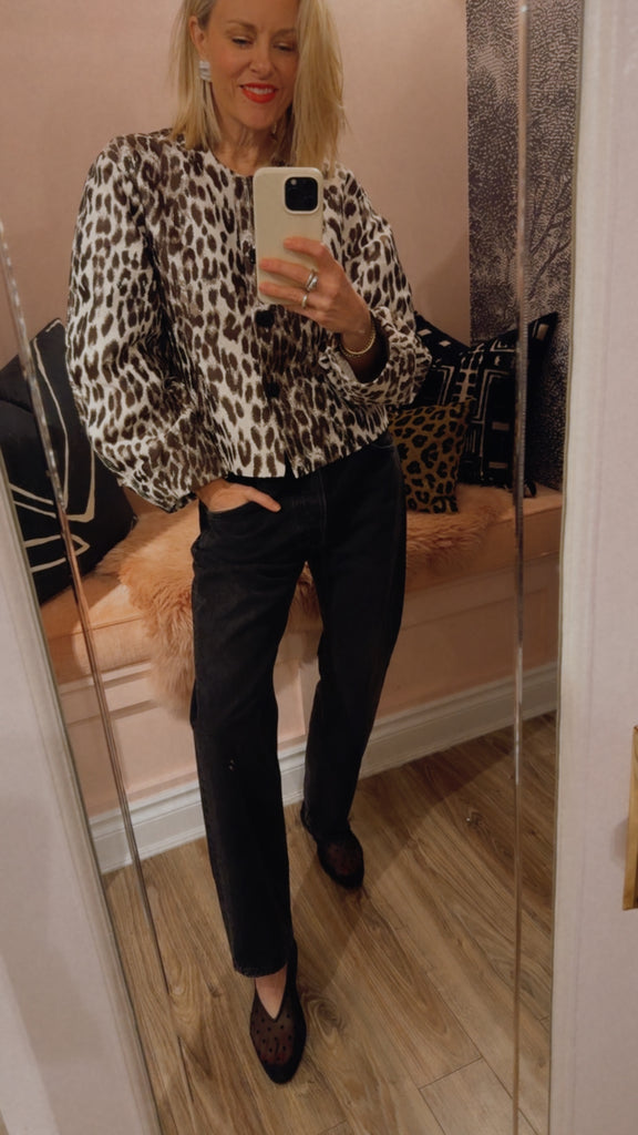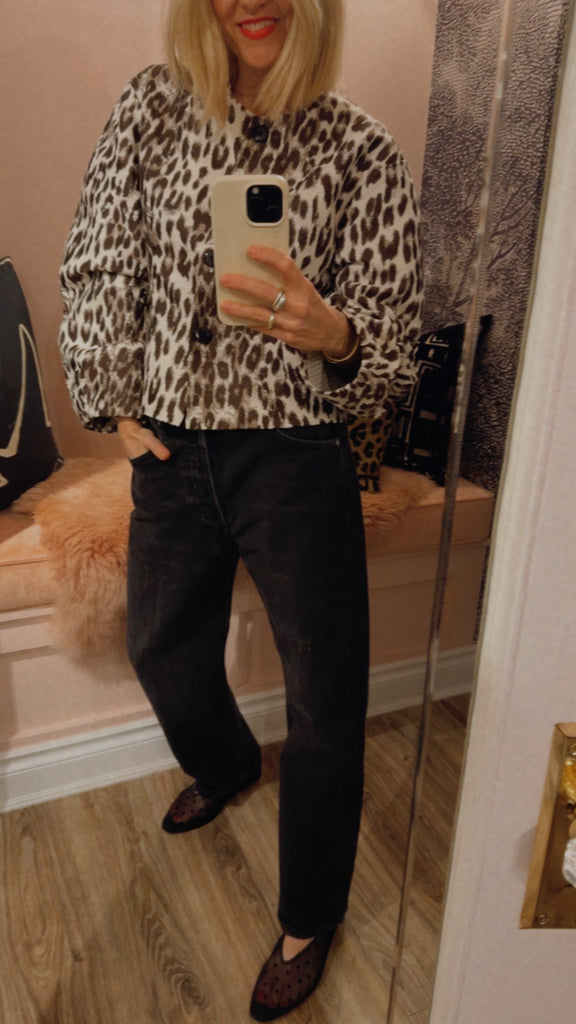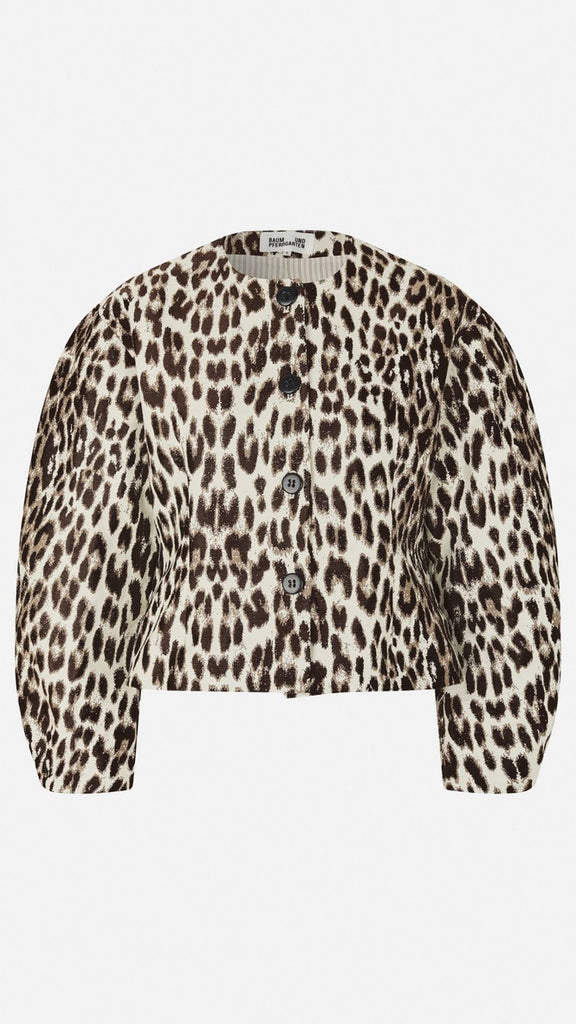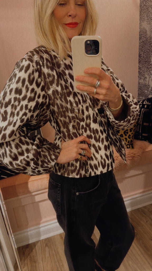 The Bonni Jacket is made in a cotton jacquard blend with a bold leopard pattern. Lined for comfort, the jacket has a relaxed fit, shaped at the waist, with dropped shoulders and wide, curved sleeves.