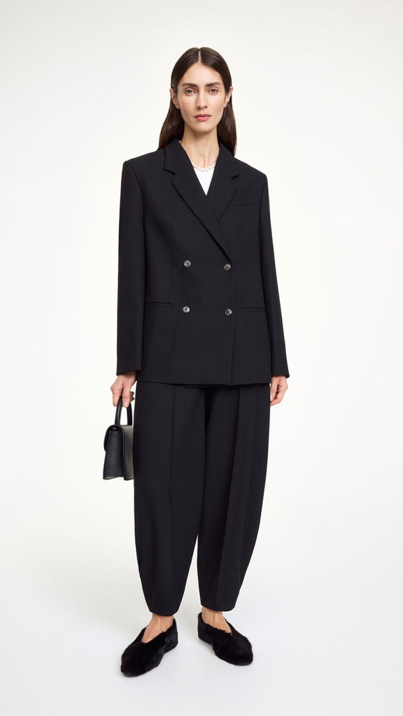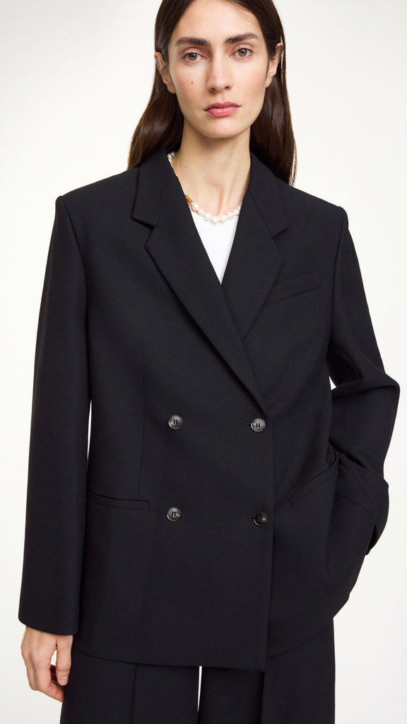 A tailored look never stops being timless. The Ramona double-breasted blazer is detailed with front pockets, double vents, and notched lapels. Designed in a slightly oversized fit, it brings a modern edge to a classic tailored shape.