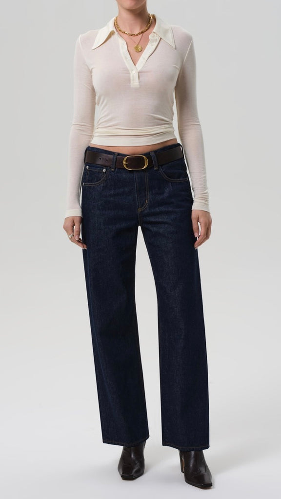 The ‘Lindz’ is a relaxed straight leg with a low rise and an effortless attitude. Crafted from rigid regenerative cotton with a soft hand, it channels a subtly undone feel. Amherst’s clean, dark rinse brings a refined edge—style with a classic button-down or oversized knit for everyday polish.