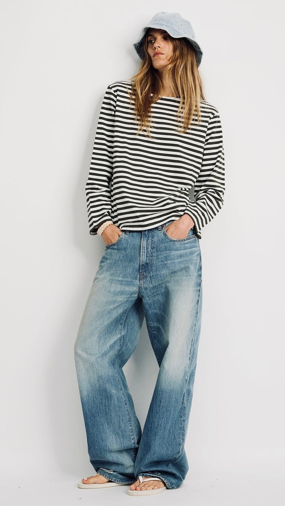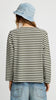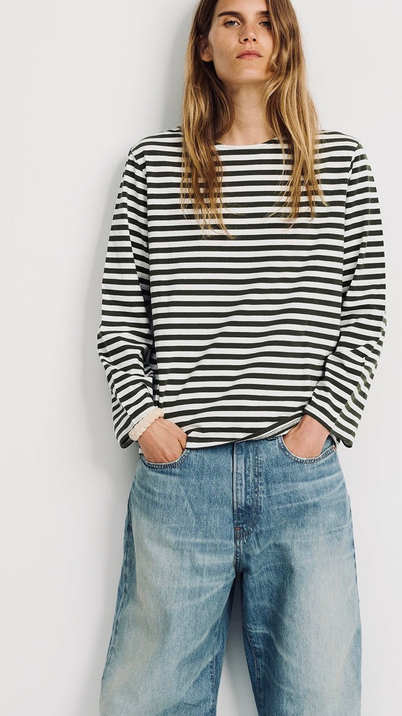 Straight-cut long sleeve tee with a boat neckline. Features horizontal olive and ecru stripes in a clean, minimal silhouette.