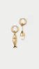 The 'Costa' Earrings are a pair of mismatched 18k gold-plated hoops featuring sculptural ocean-inspired charms. One earring features our signature fish motif charm with a cubic zirconia eye, while the other is finished with a gold teardrop halved by clear resin.