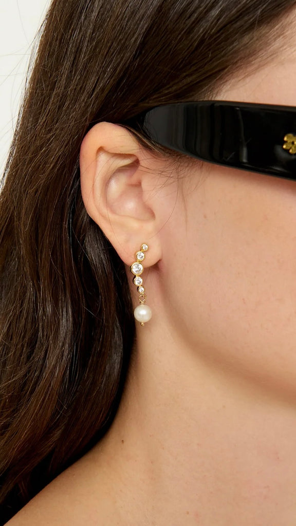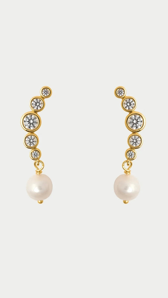 The 'Elene' Earrings feature a curved row of cubic zirconia stones set in 18k gold plating, finished with a freshwater pearl drop.