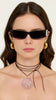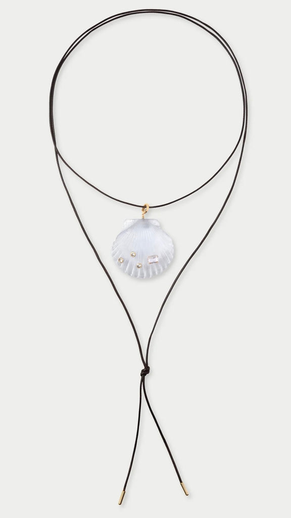 Our Vieira Wrap features a sculptural resin shell pendant suspended from an adjustable leather cord. The pendant captures the ridged, fan-like form of a scallop shell, accented with delicate cubic zirconia details.