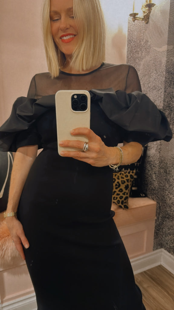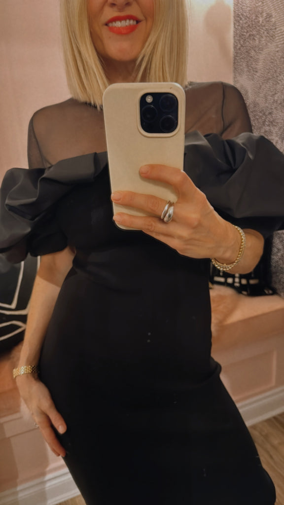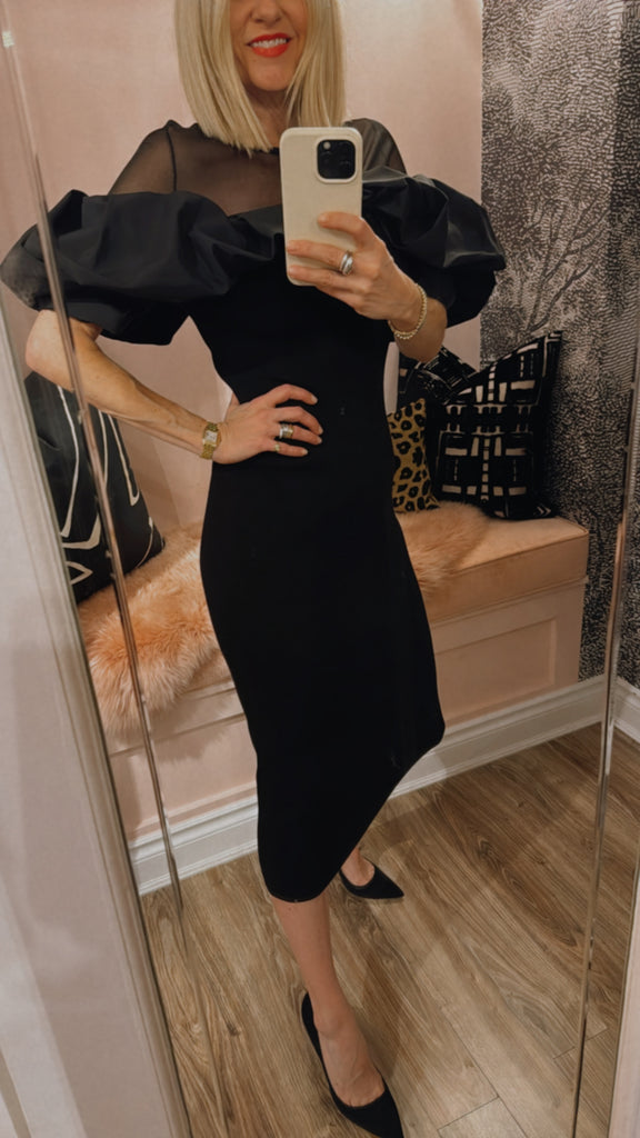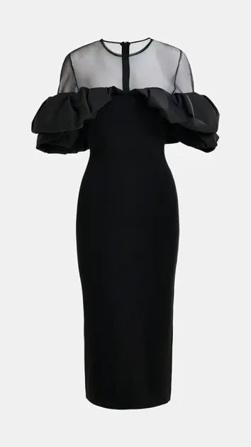 Ribbed dress features a close-fitting silhouette accented by voluminous ruffles that frame the shoulders for a dramatic effect. The sheer tulle yoke and sleeves add an airy lightness, balancing the structured design. Falling to a straight midi hem, it makes a striking choice for evening occasions.