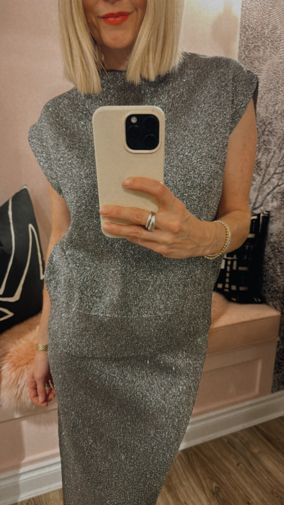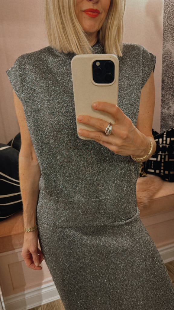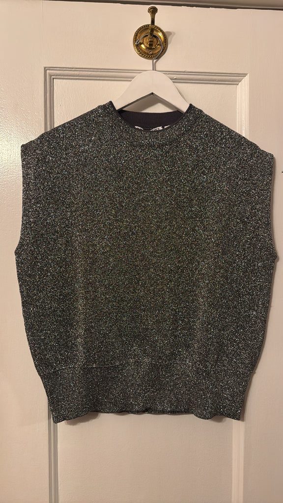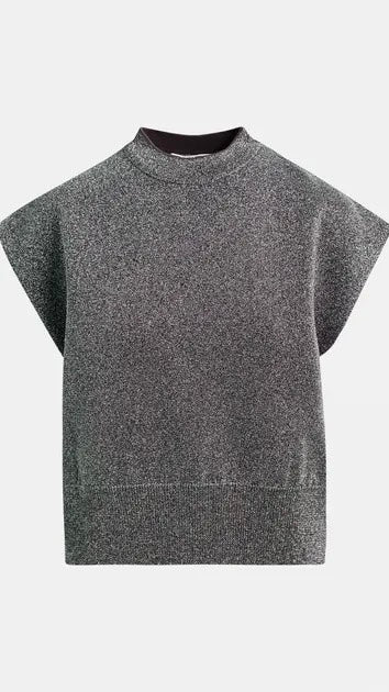 Finely knitted with glistening metallic threads throughout, this sleeveless top is cut for an oversized fit with angular shoulders and a stand-up collar. Finished with ribbed trims, this piece is perfect for layering or wearing solo.