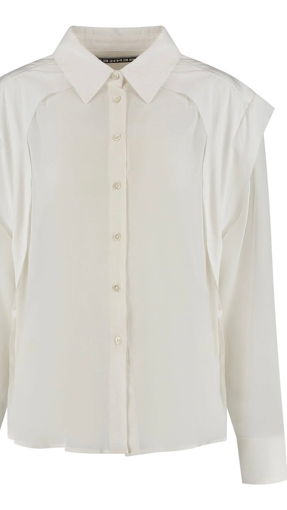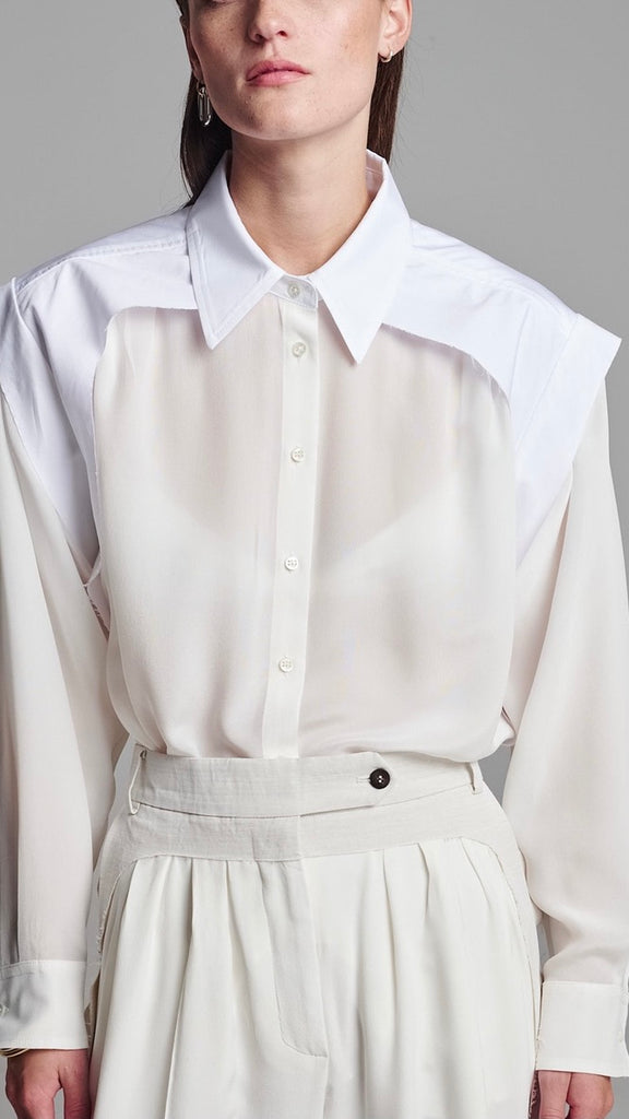 Structured shoulders meet a fluid, semi-sheer body in this reimagined white shirt. The cut-out construction reveals a contrast panel that sharpens the silhouette while keeping the look light. Clean lines and subtle volume add a modern, architectural feel. Perfect for elevated styling with an unexpected edge.
