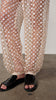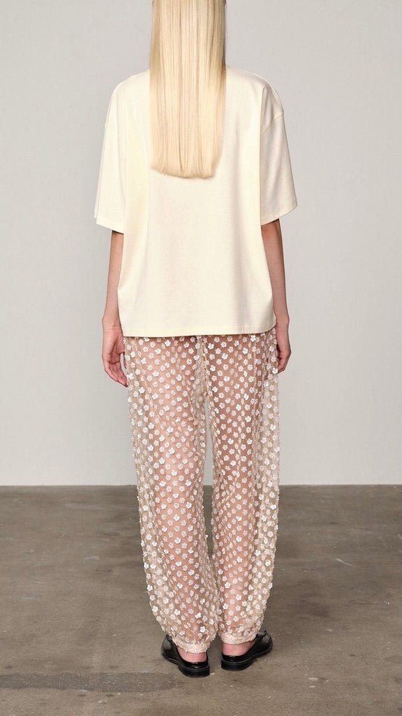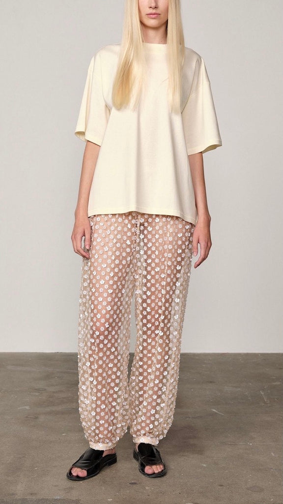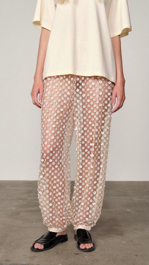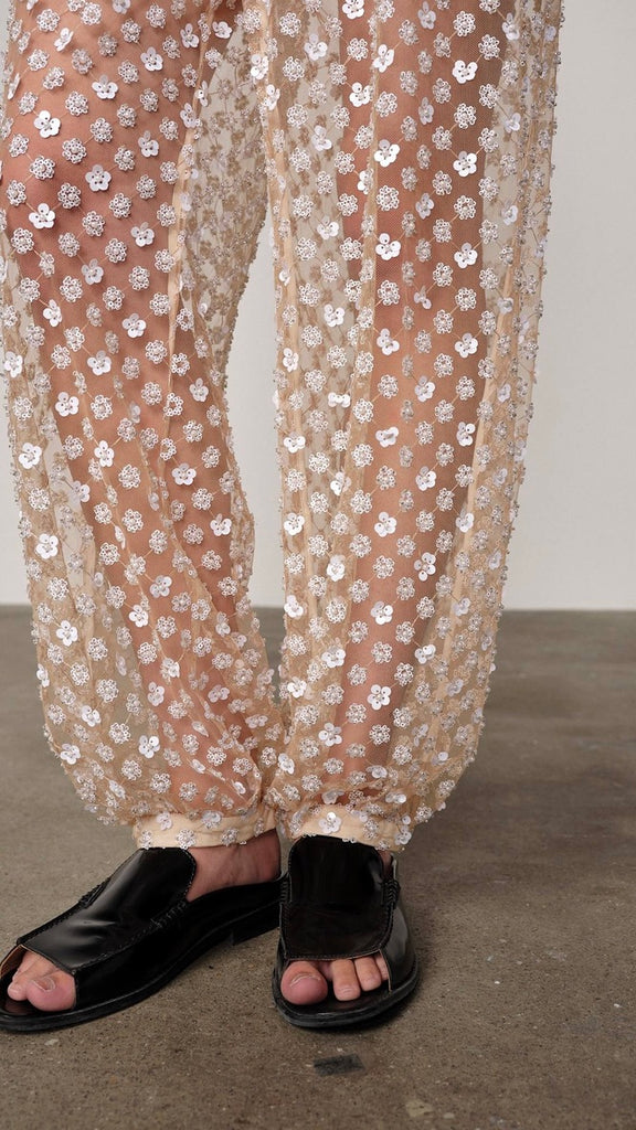 Embroidered mesh pants designed for layering or statement styling. The straight cut and sheer texture bring a distinctive, directional edge.