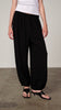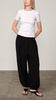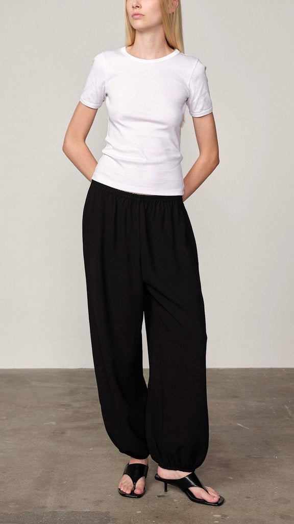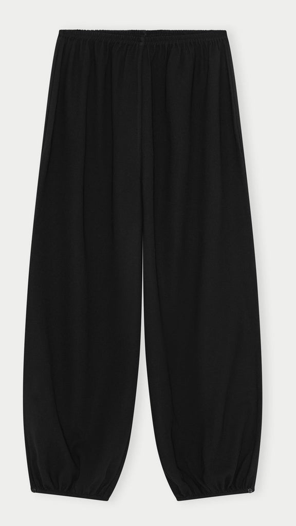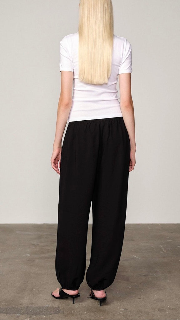 Wide-leg satin harem trousers for elegant evening wear. The lightweight fabric adds movement and refined polish to the silhouette.