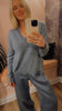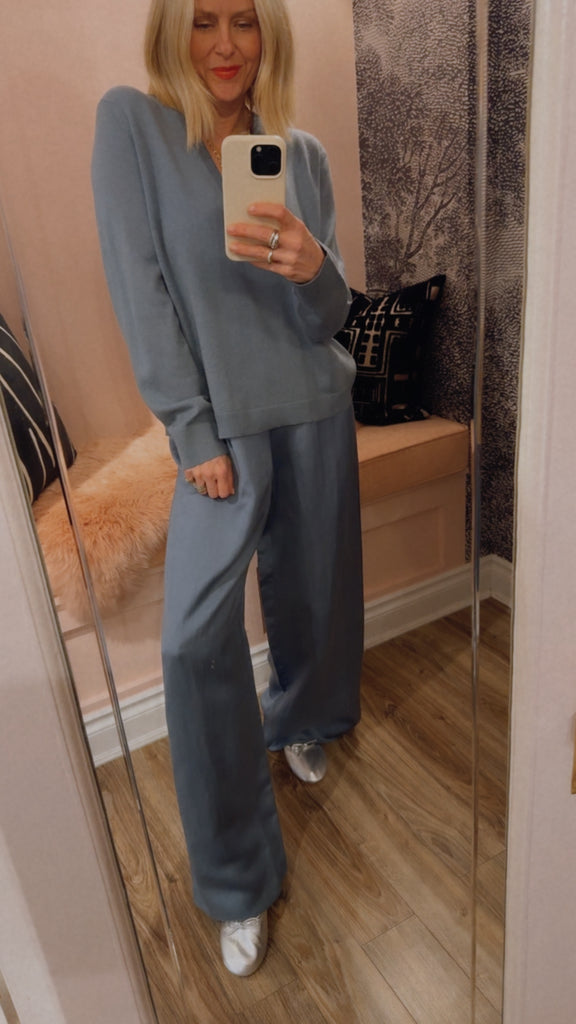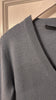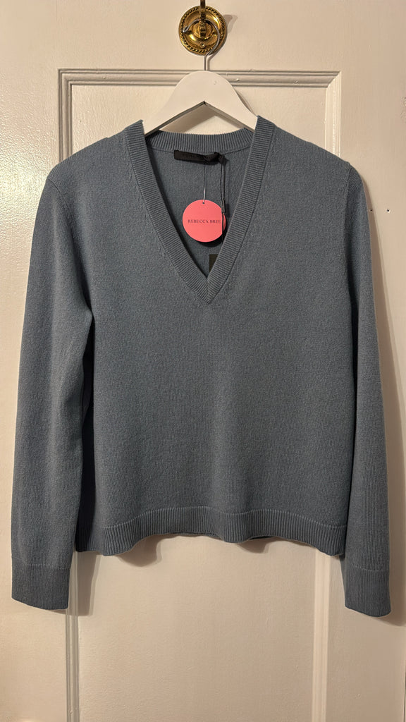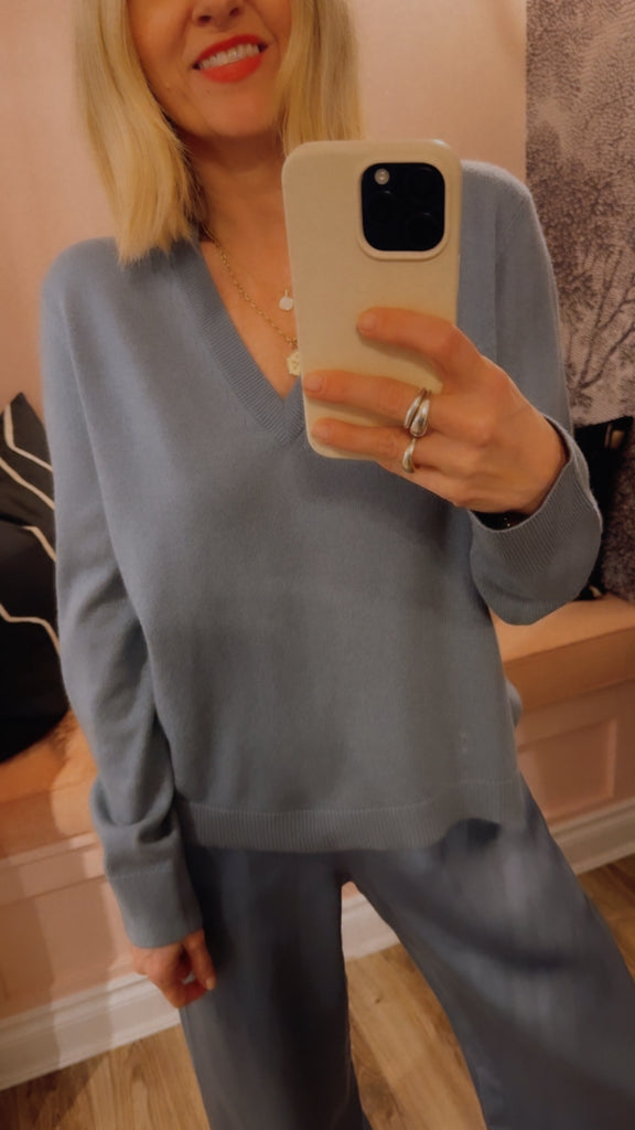 100% cashmere, in Dusty Blue.