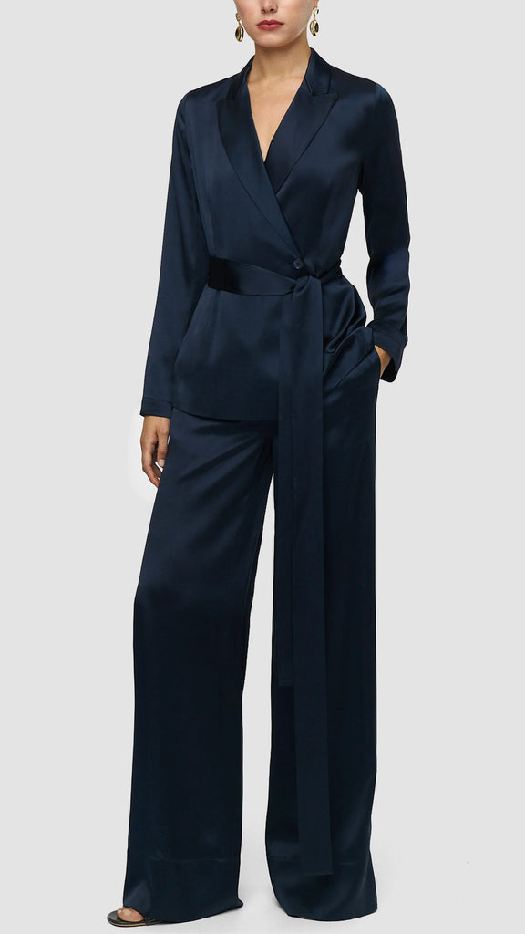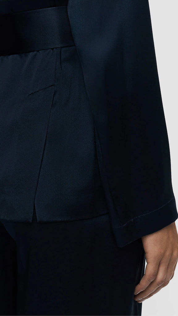The Archer Silk Satin Jacket is a relaxed fit jacket, crafted from a lustrous silk with an ultra-smooth hand feel and fluid drape. It's elegantly finished with a wide tie belt and silk covered buttons. A modern take on relaxed tailoring, perfect layered over trousers or styled as a standalone piece.