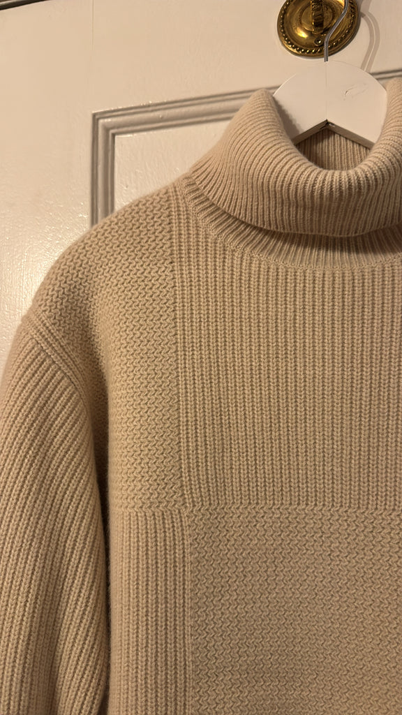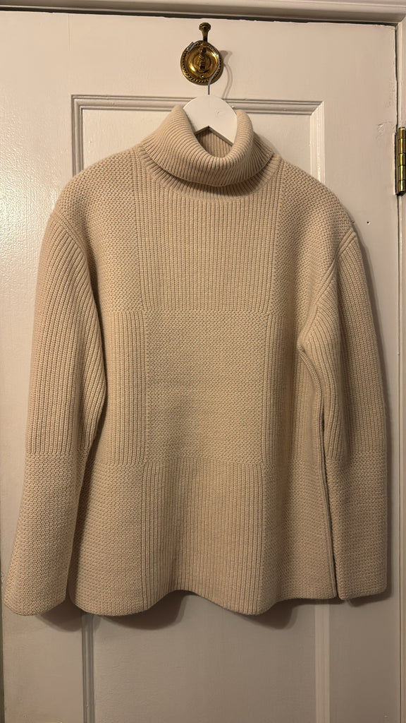 Part of the permanent Foundations Collection, the Cardigan Stitch High Neck Jumper is a relaxed fit, oversized knit jumper, crafted from a fine merino wool. This heavy weight knit features dropped shoulders and is finished in a chunky cardigan stitch, with needlework detailing at the collar and shoulders.