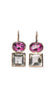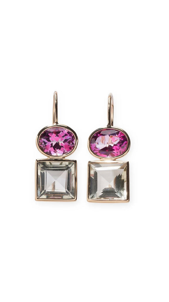 In 14k gold with a pink topaz oval top and green amethyst square bottom.