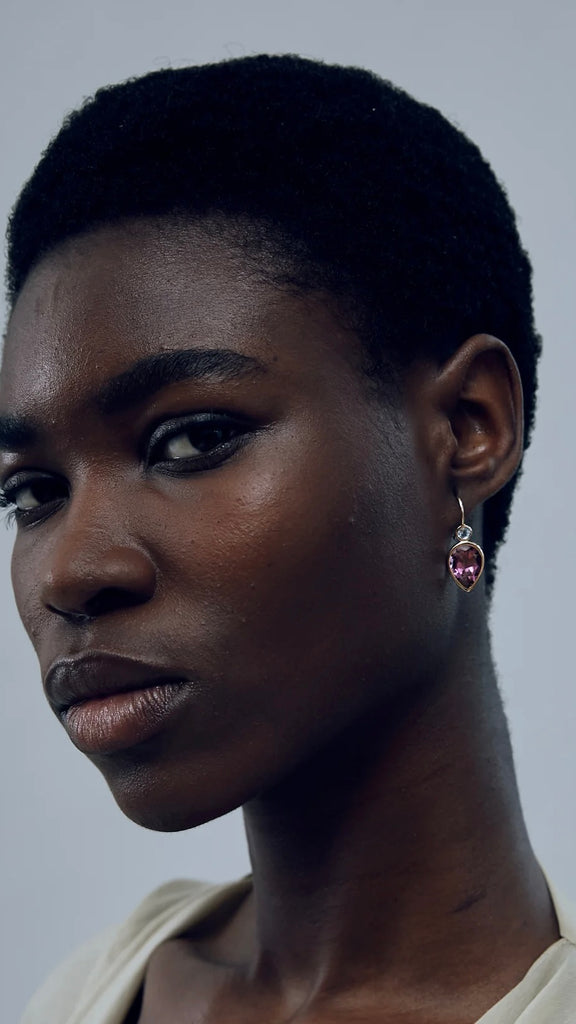 Because you are strong, graceful, and beloved. Go full goddess in a pair of stunningly crafted earrings of sky blue topaz faceted, pear-shaped pink topaz stones, enrobed in 14k gold bezels.