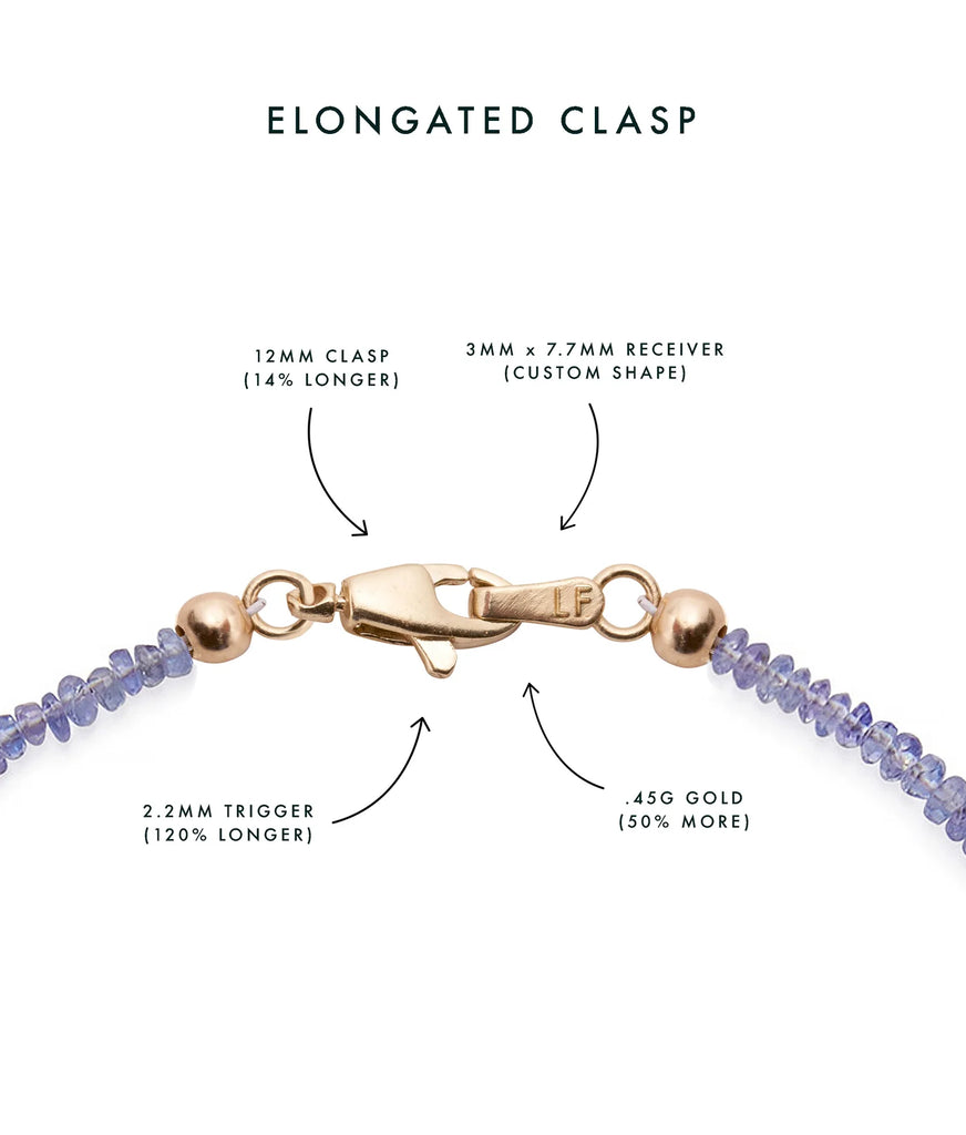 This necklace comes in 18" length, with an elongated 14k gold clasp for easier handling.