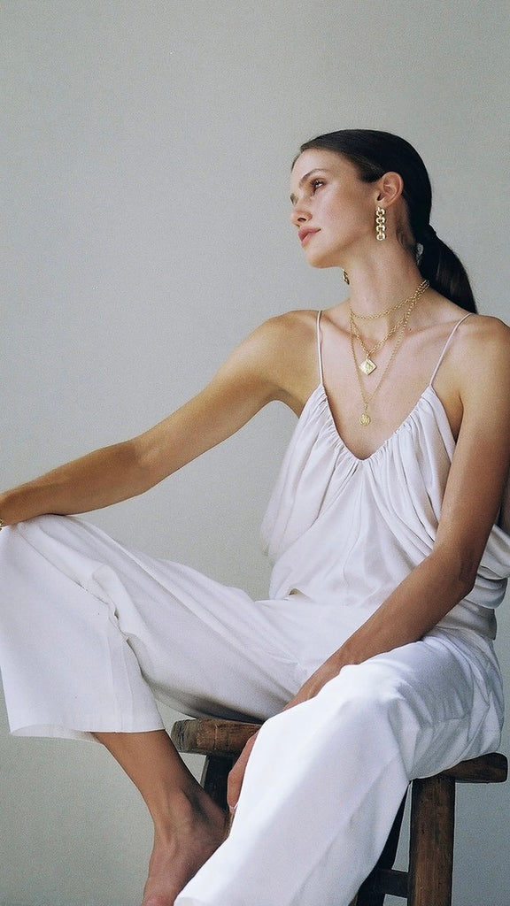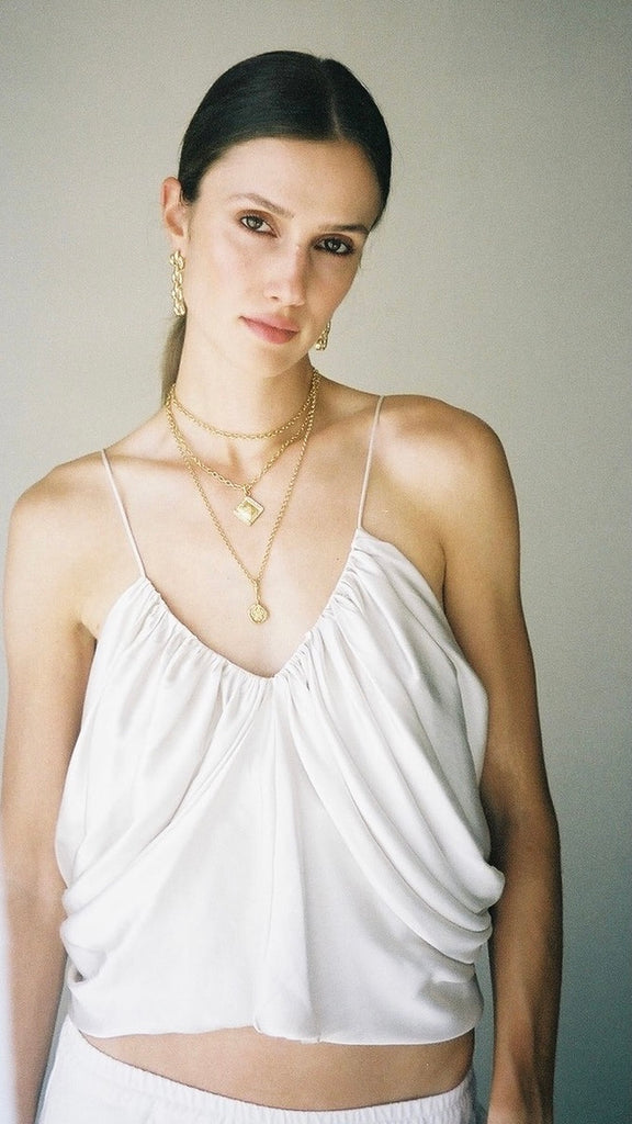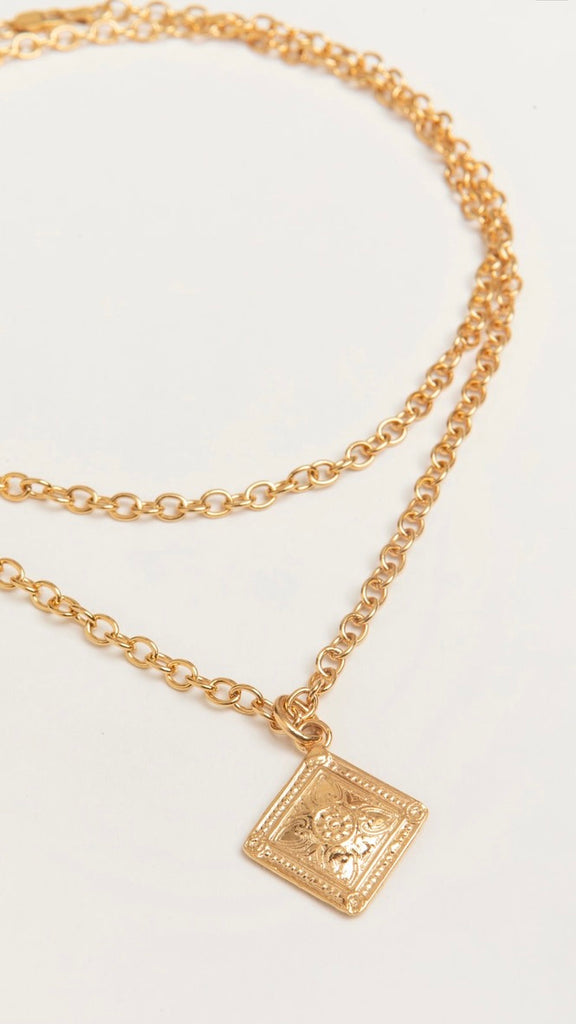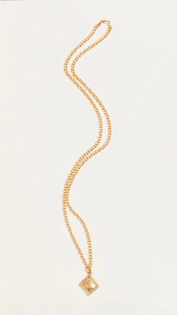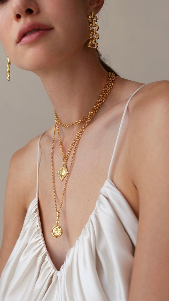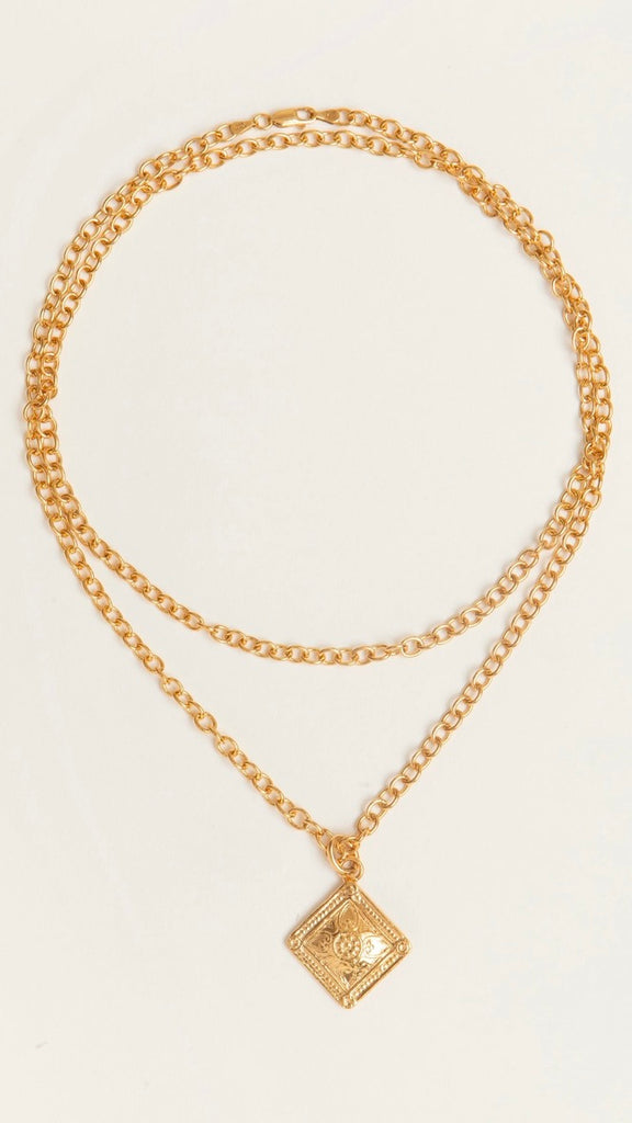 This necklace moves with ease - worn wrapped high at the collarbone or left to fall to its full, plunging length. The rhombus pendant captures the refined opulence of a rococo palace, from manicured garden to gilded salon, embodying feminine grace, lasting legacy, and quiet strength.