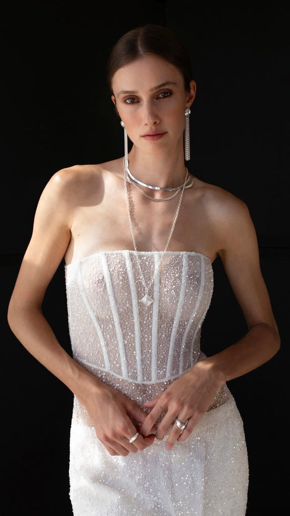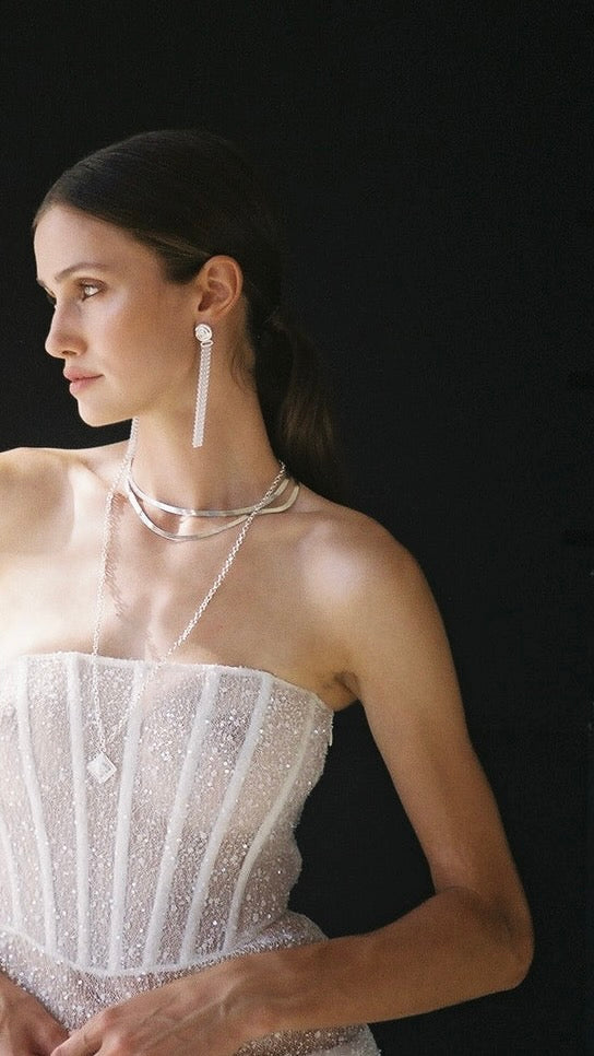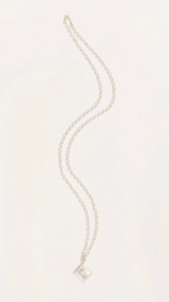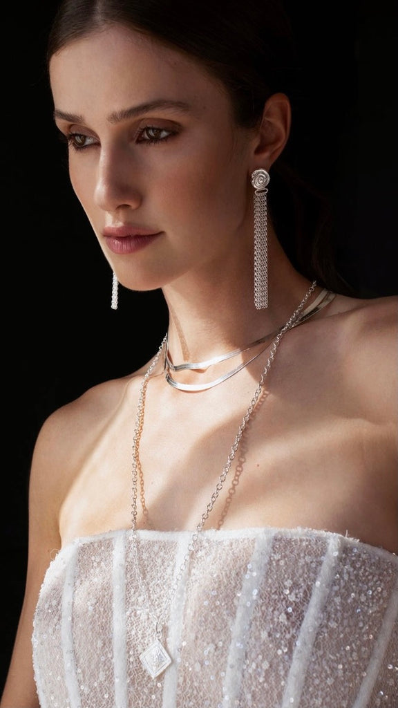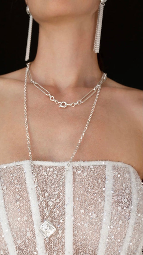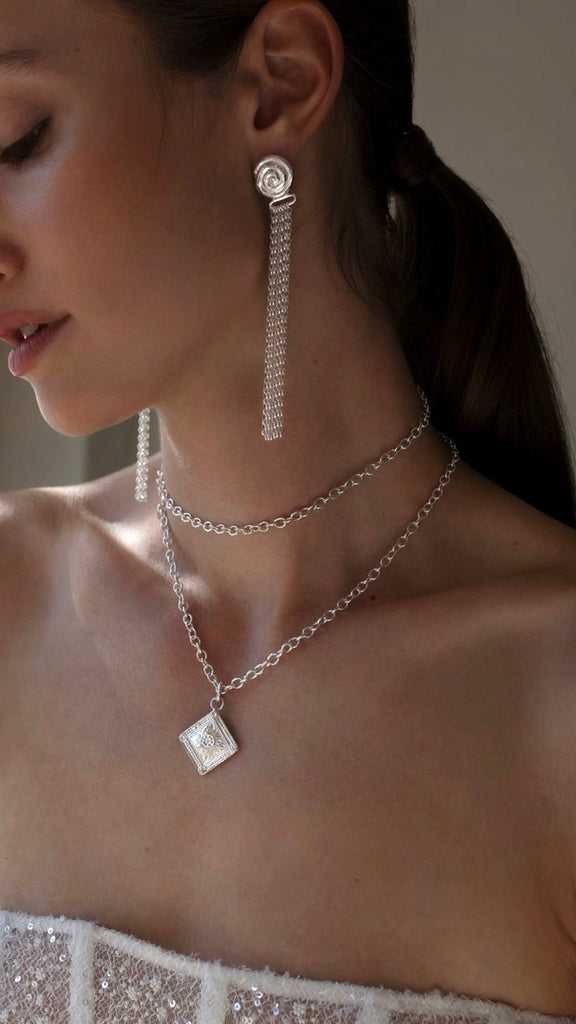 This necklace moves with ease - worn wrapped high at the collarbone or left to fall to its full, plunging length. The rhombus pendant captures the refined opulence of a rococo palace, from manicured garden to gilded salon, embodying feminine grace, lasting legacy, and quiet strength.