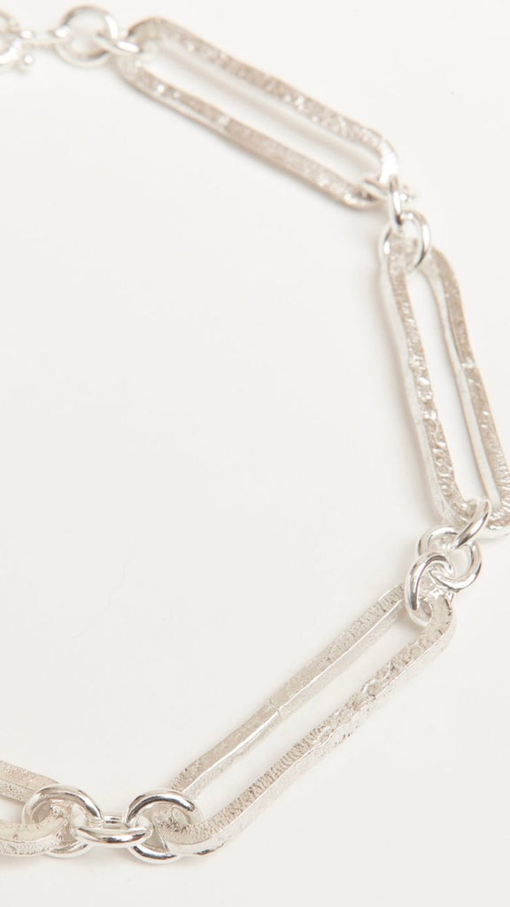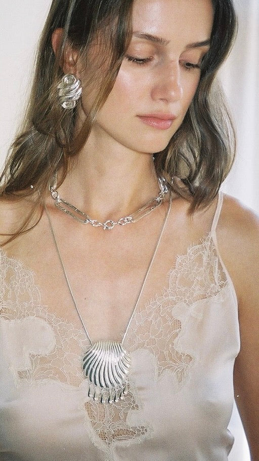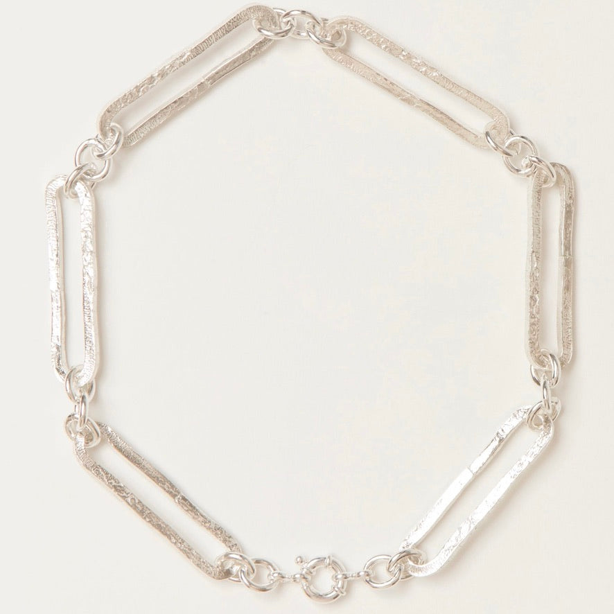 This weighty statement piece is crafted from handmade molten trombone links, connected by sets of three smooth links that represent the child, the mother, and the grandmother - embodying the continuum of generations. Historically, link necklaces have symbolized relationships among women, often passed down as heirlooms from mother to daughter, reflecting lineage through the female line.
