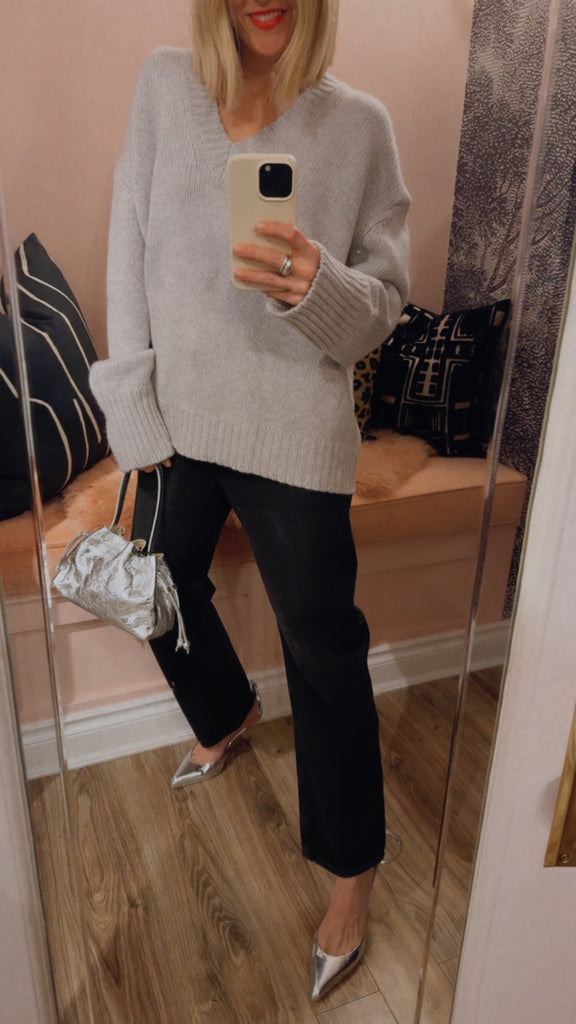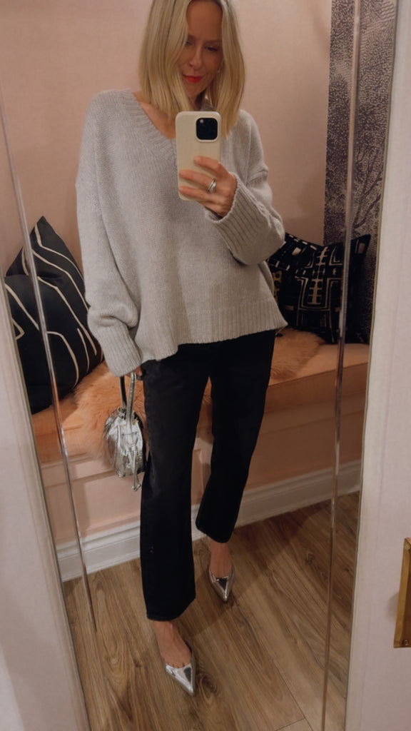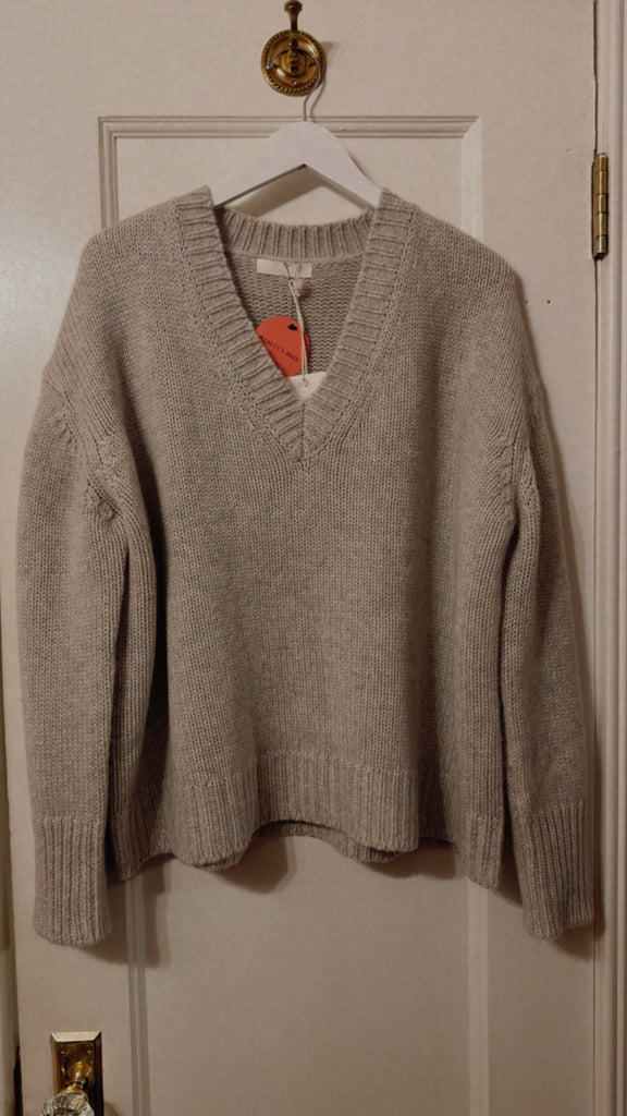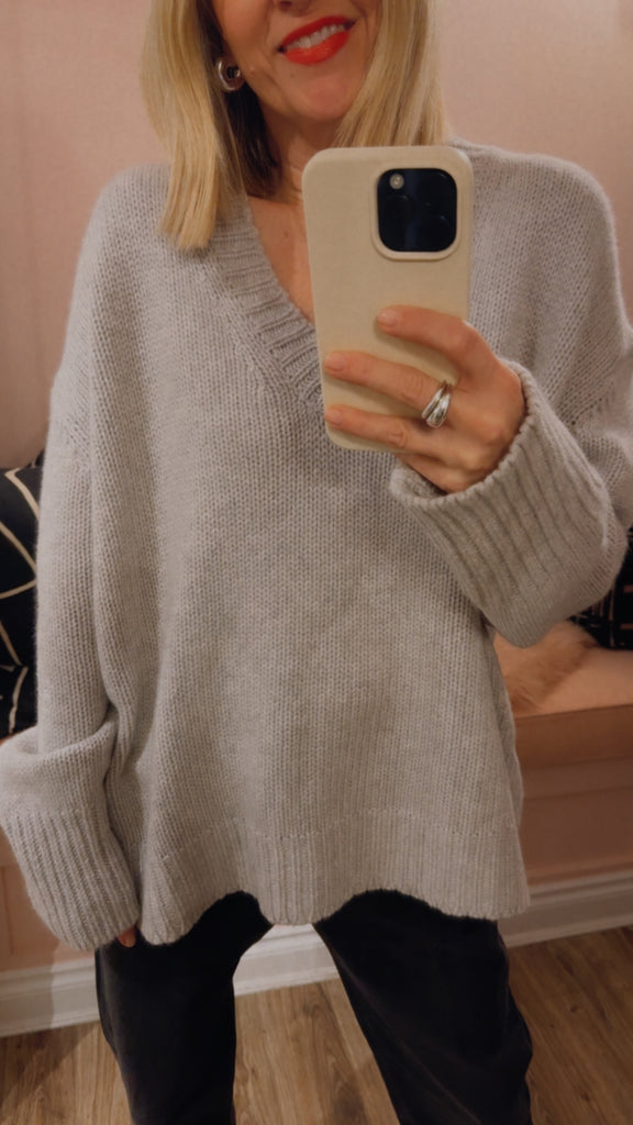 The Nylah sweater is an oversized V-neck sweater with dropped armholes and made in a super soft cashmere knit.