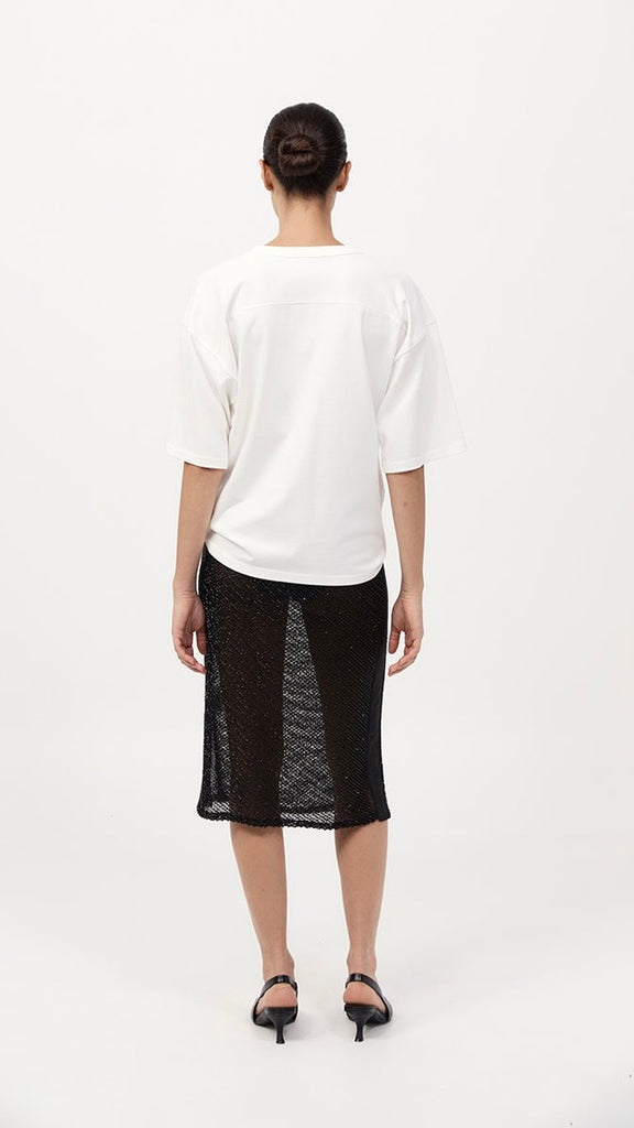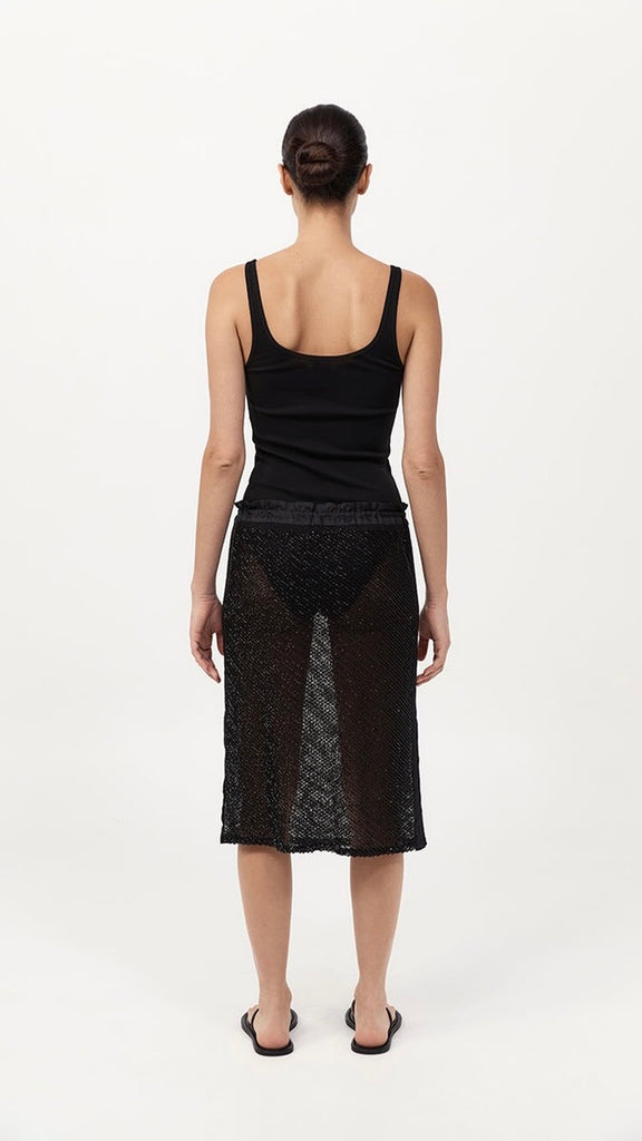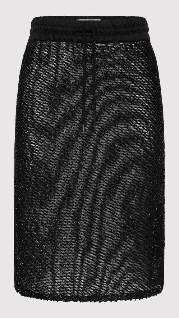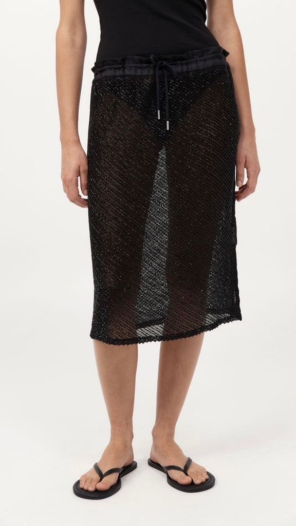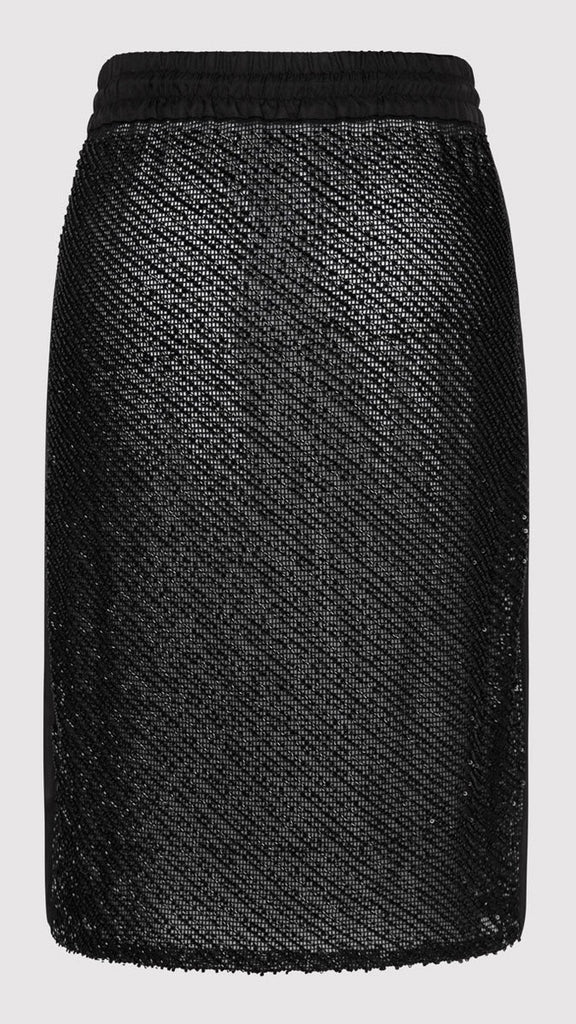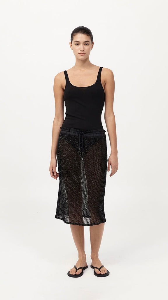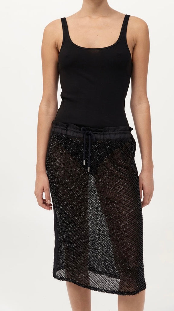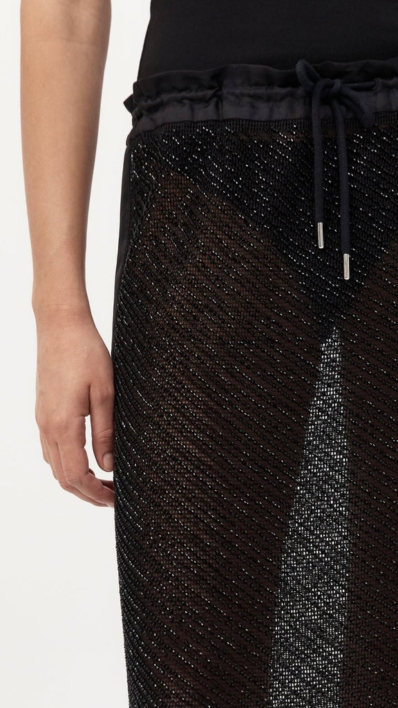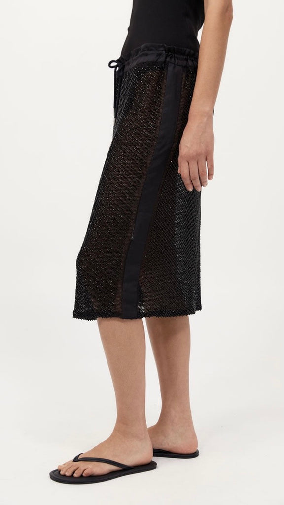 The Glass Beaded Mesh Skirt strikes a balance between artistry and ease. Designed with a mid-rise drawstring waist and knee length. Adorned with hand-applied glass beads, the Glass Beaded Mesh Skirt can be simply styled as a set with the Glass Beaded Mesh Top.