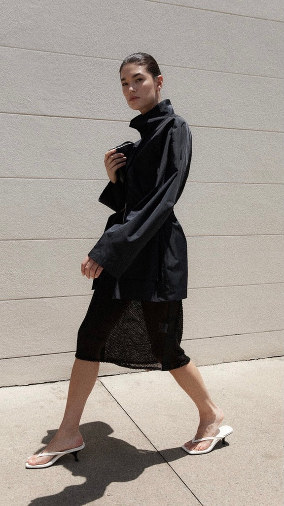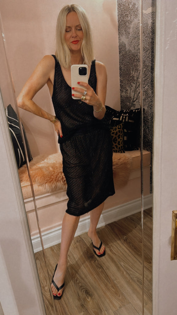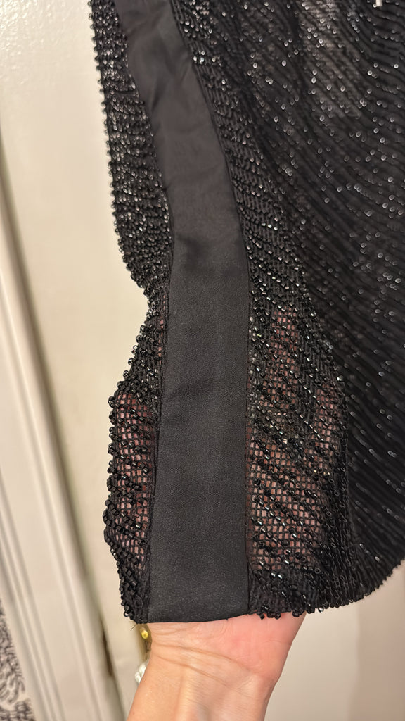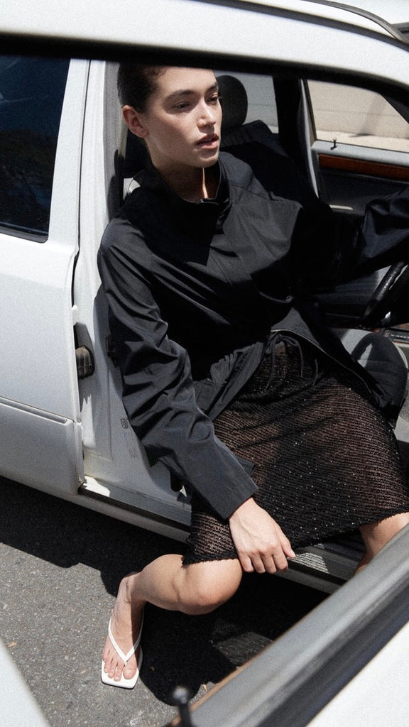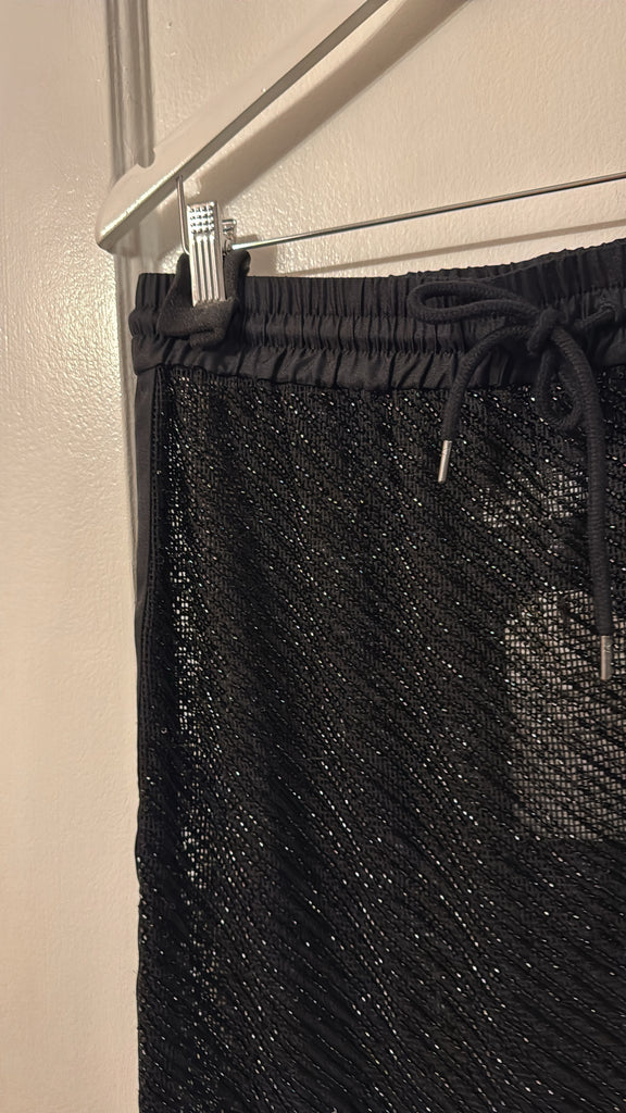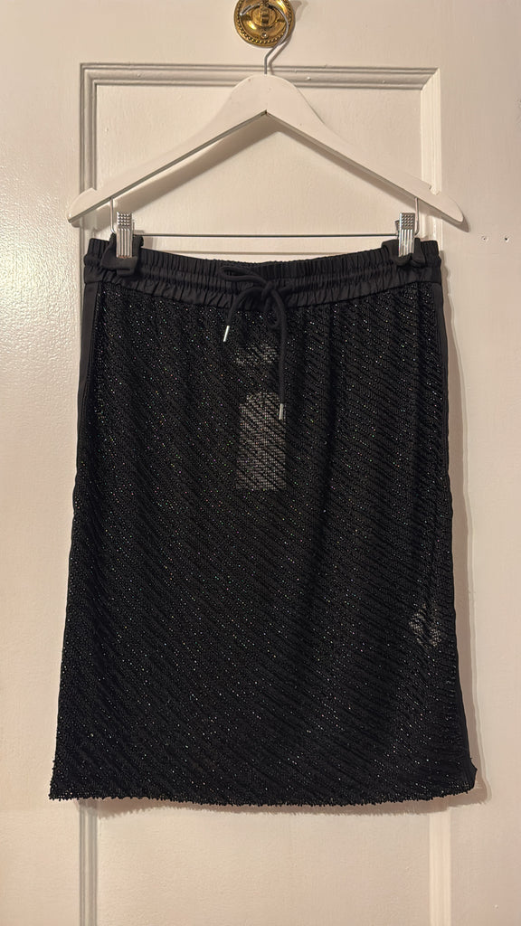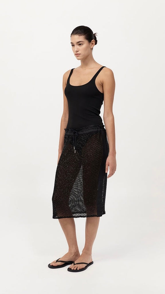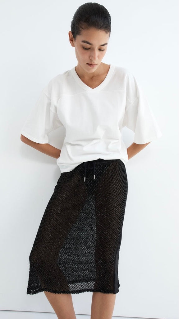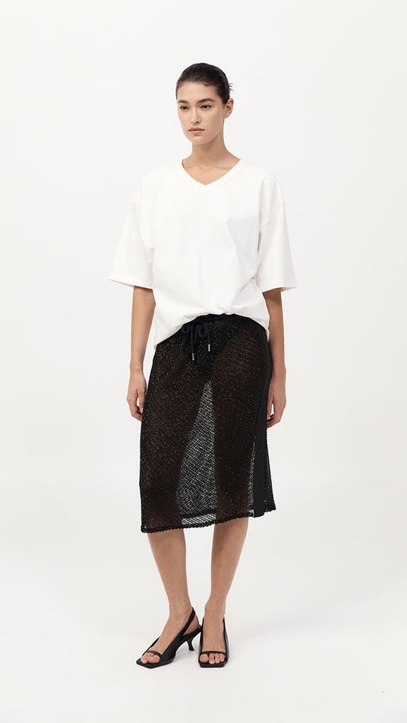 The Glass Beaded Mesh Skirt strikes a balance between artistry and ease. Designed with a mid-rise drawstring waist and knee length. Adorned with hand-applied glass beads, the Glass Beaded Mesh Skirt can be simply styled as a set with the Glass Beaded Mesh Top.