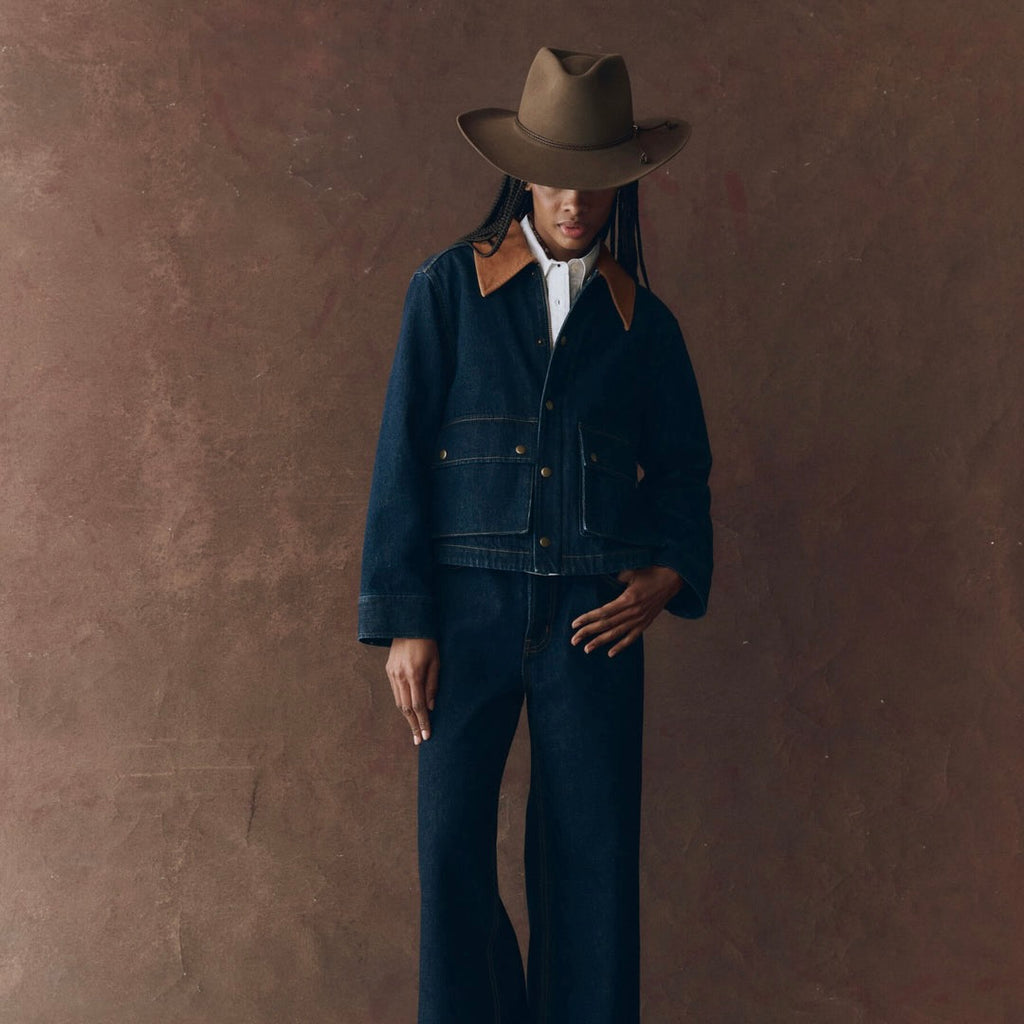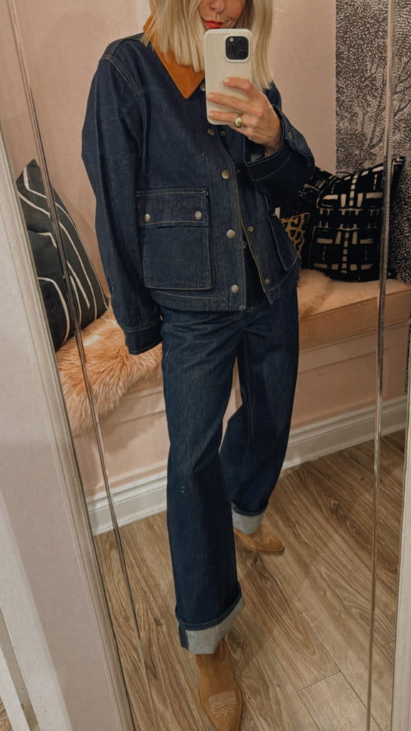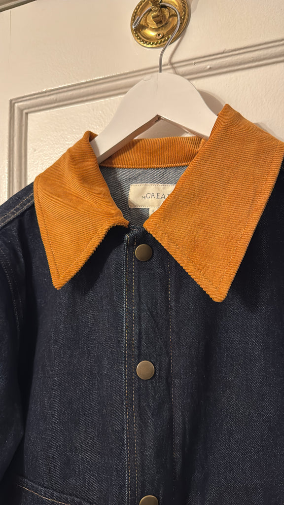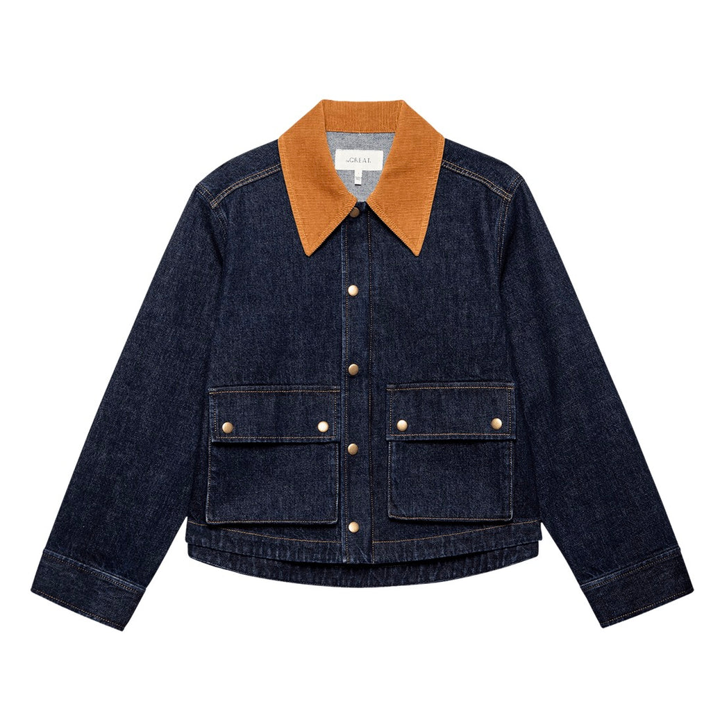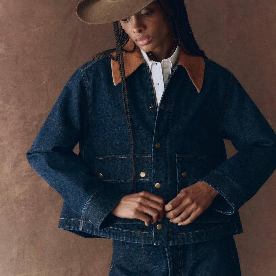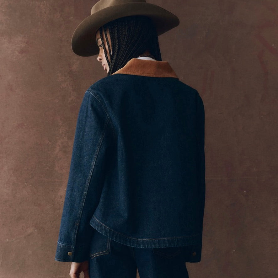 Inspired by heritage-style barn jackets, this reproduction has been reinterpreted with more interesting proportions. It features a cropped length that is longer at the back, creating a charming swing shape. The jacket is made of a structured rinse denim with a corduroy collar that adds authentic detailing. It also includes a snap-front closure with a hidden front zipper, along with traditionally pleated, three-dimensional pockets and snaps at the flap closure.