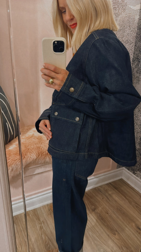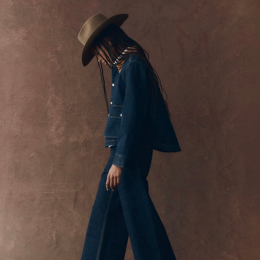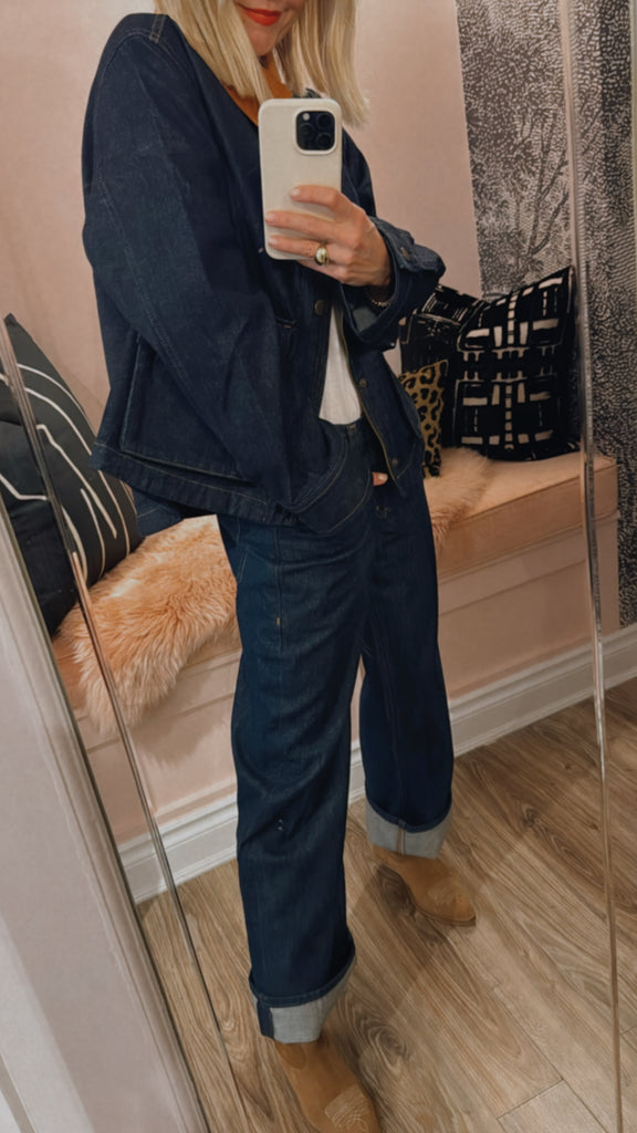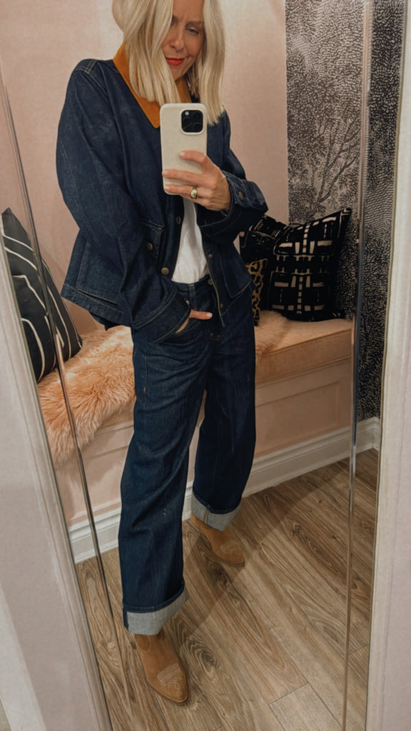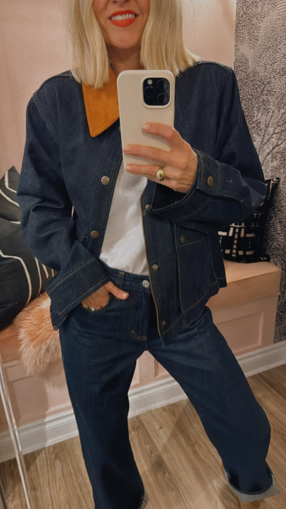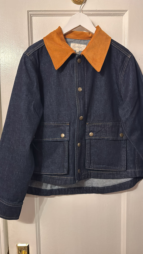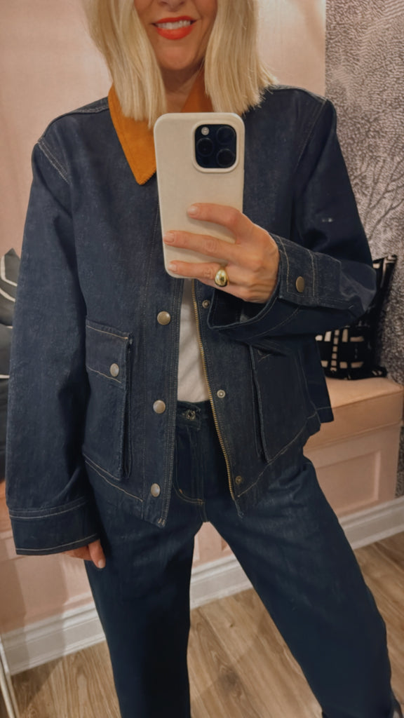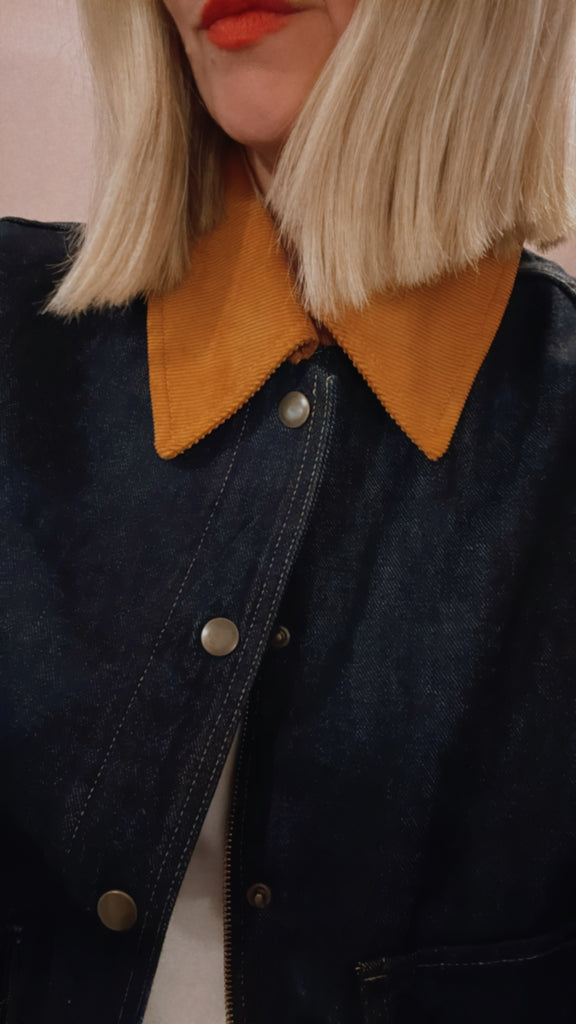 Inspired by heritage-style barn jackets, this reproduction has been reinterpreted with more interesting proportions. It features a cropped length that is longer at the back, creating a charming swing shape. The jacket is made of a structured rinse denim with a corduroy collar that adds authentic detailing. It also includes a snap-front closure with a hidden front zipper, along with traditionally pleated, three-dimensional pockets and snaps at the flap closure.