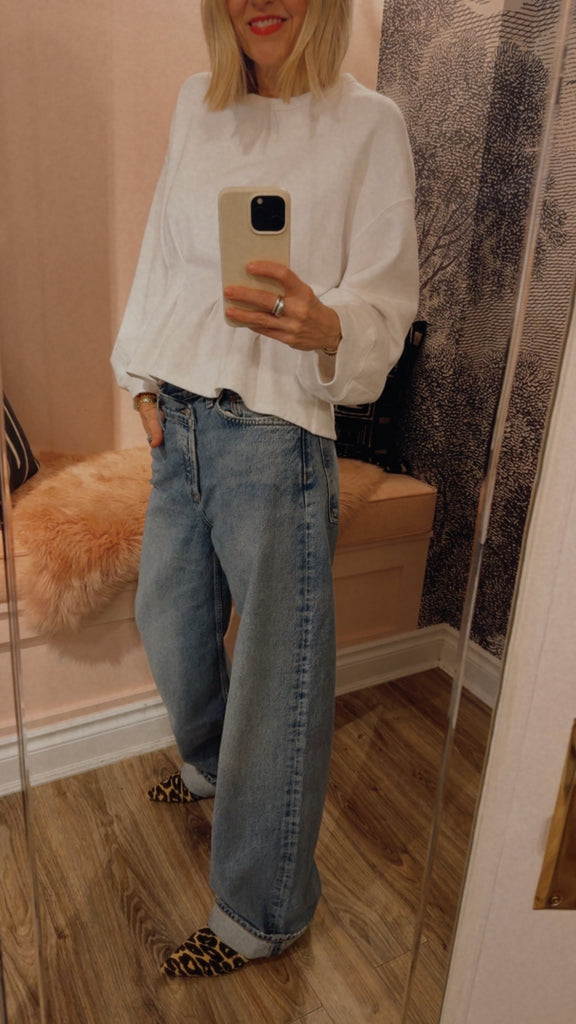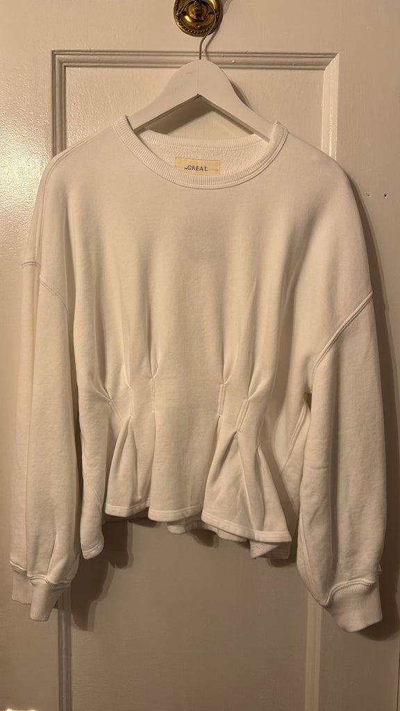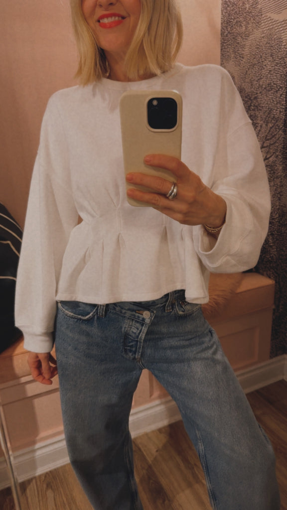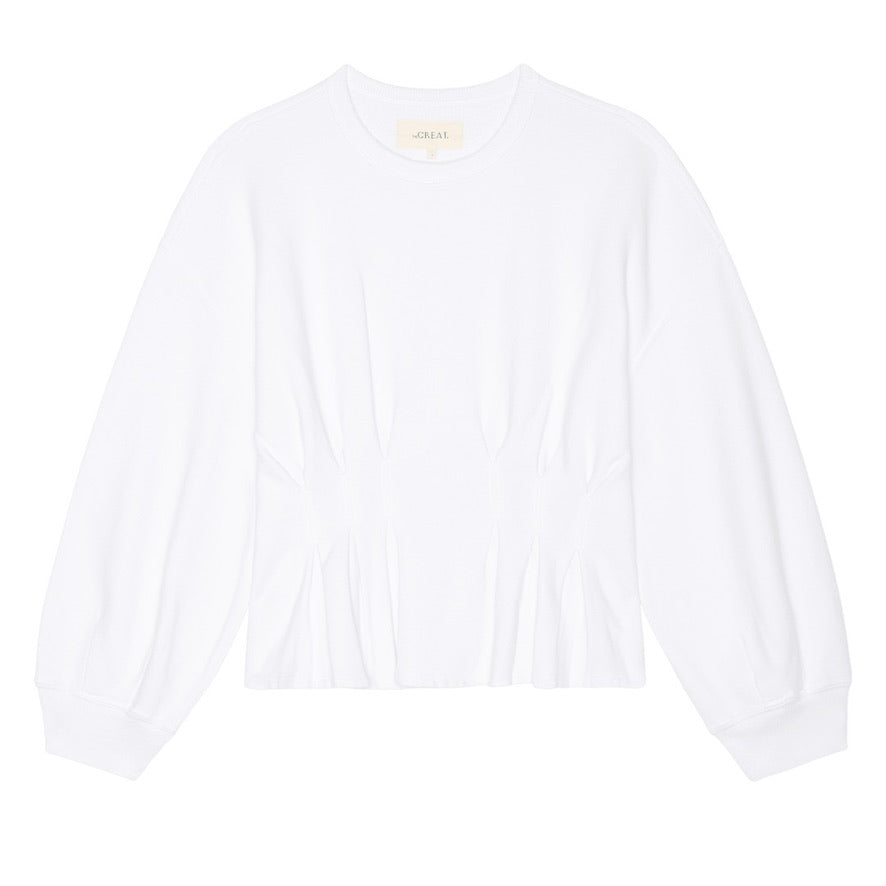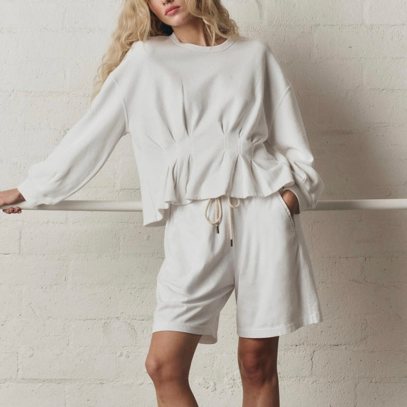 A playful take on a favourite vintage-inspired sweatshirt, reimagined with a softly feminine shape. It carries all the details we love— a classic crew neckline, slouchy fit, vintage-inspired seaming, and full sleeves—while subtle pleating at the waist creates a gently nipped silhouette without losing its relaxed ease.