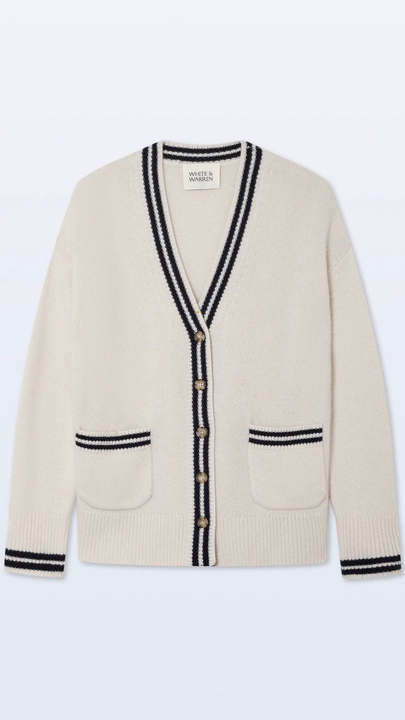 The ultimate throw-on-and-go layer. Crafted from three ends of cashmere for a structured drape, this boyfriend-style cardigan is finished with wide rib trims, contrast tipping, and clean patch pockets.